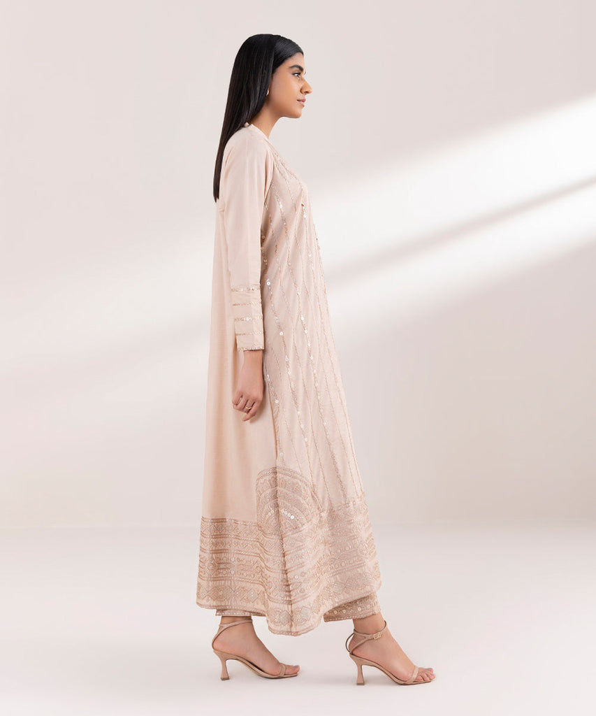 Immerse yourself in festive elegance with our light brown embroidered zari lawn A-line shirt featuring a bottom slit and Y-neckline.