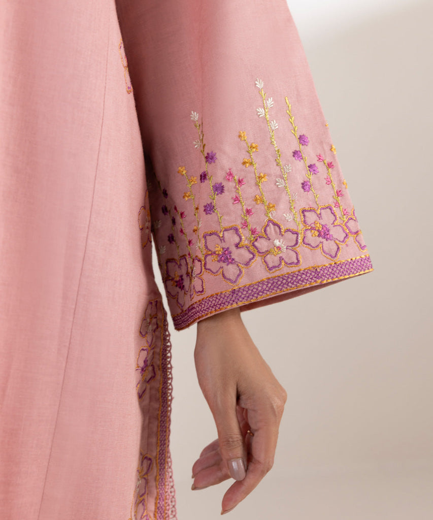 A-Line ShirtCurate a classy festive look in our deep tea pink, long A-line cotton linen shirt featuring embroidery. D...