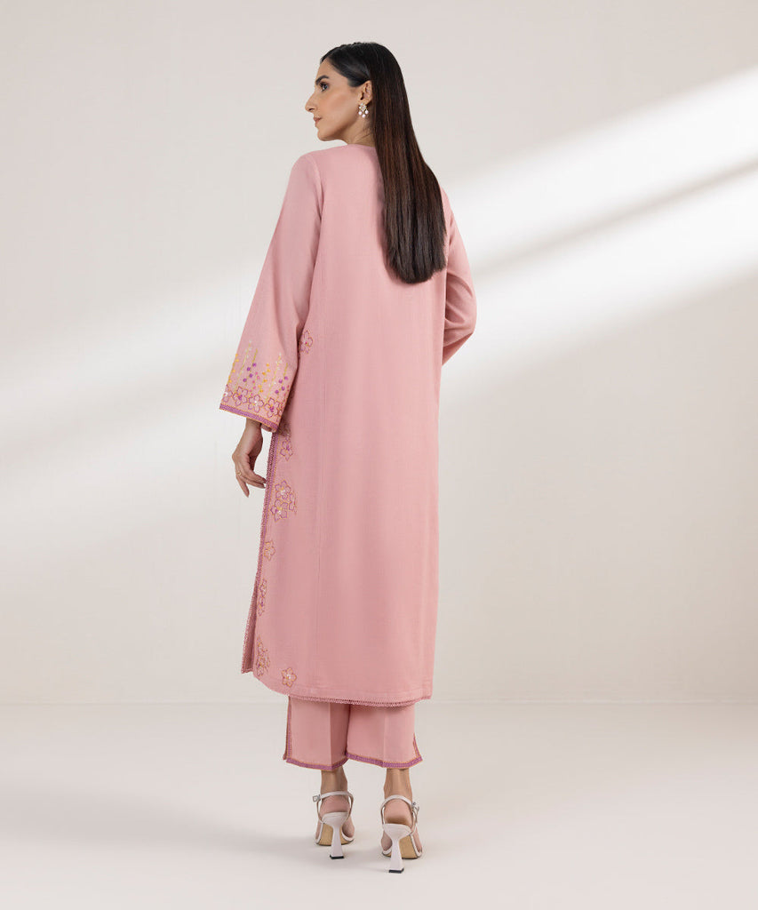 Curate a classy festive look in our deep tea pink, long A-line cotton linen shirt featuring embroidery.