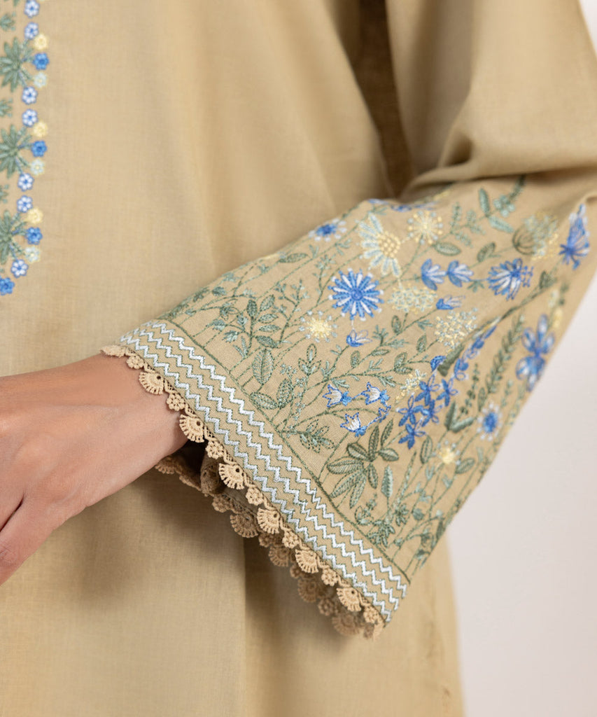 A-Line ShirtCurate a classy festive look in our camel brown, long A-line cotton linen shirt featuring embroidery.