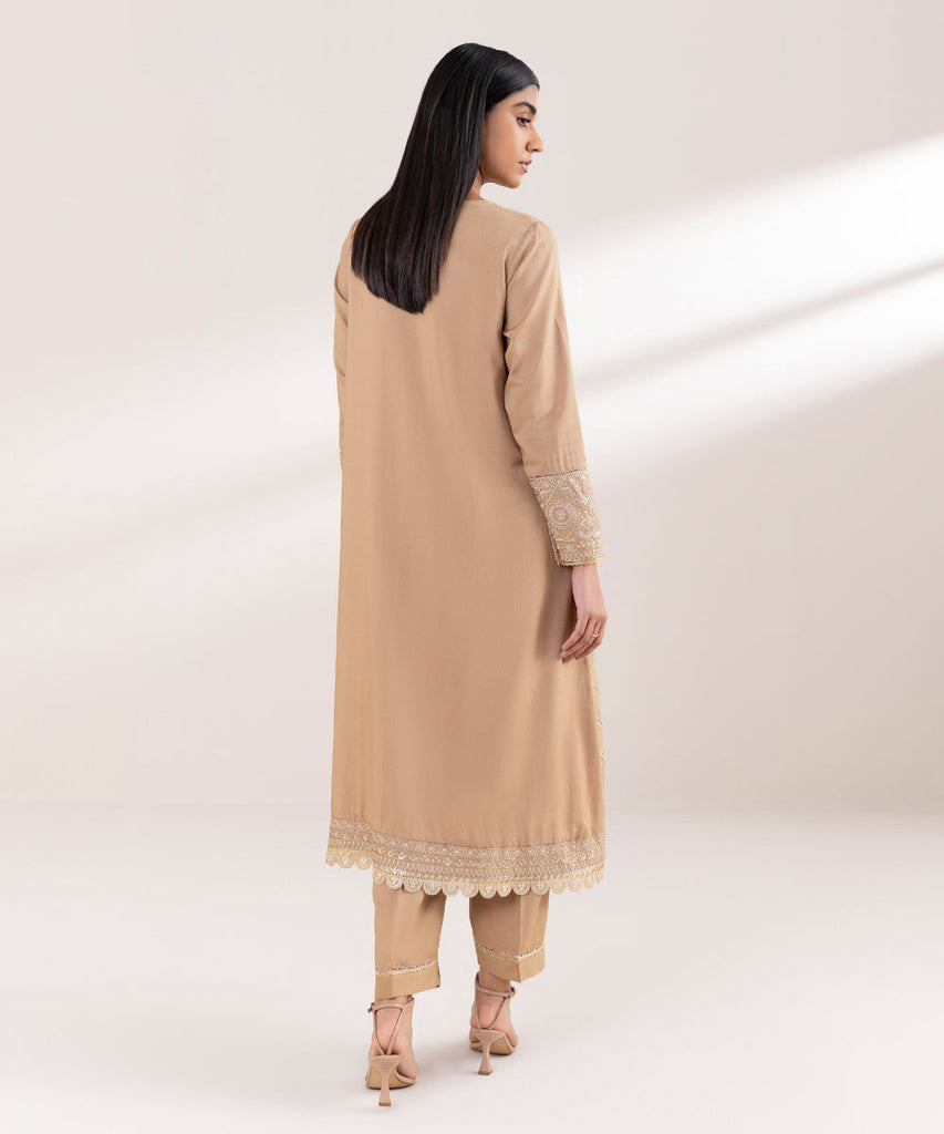 Elevate your festive fit with our camel brown A-line flared embroidered shirt featuring a V-neckline.