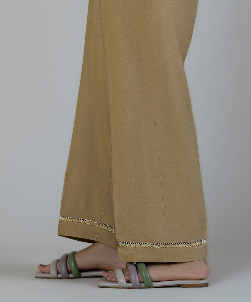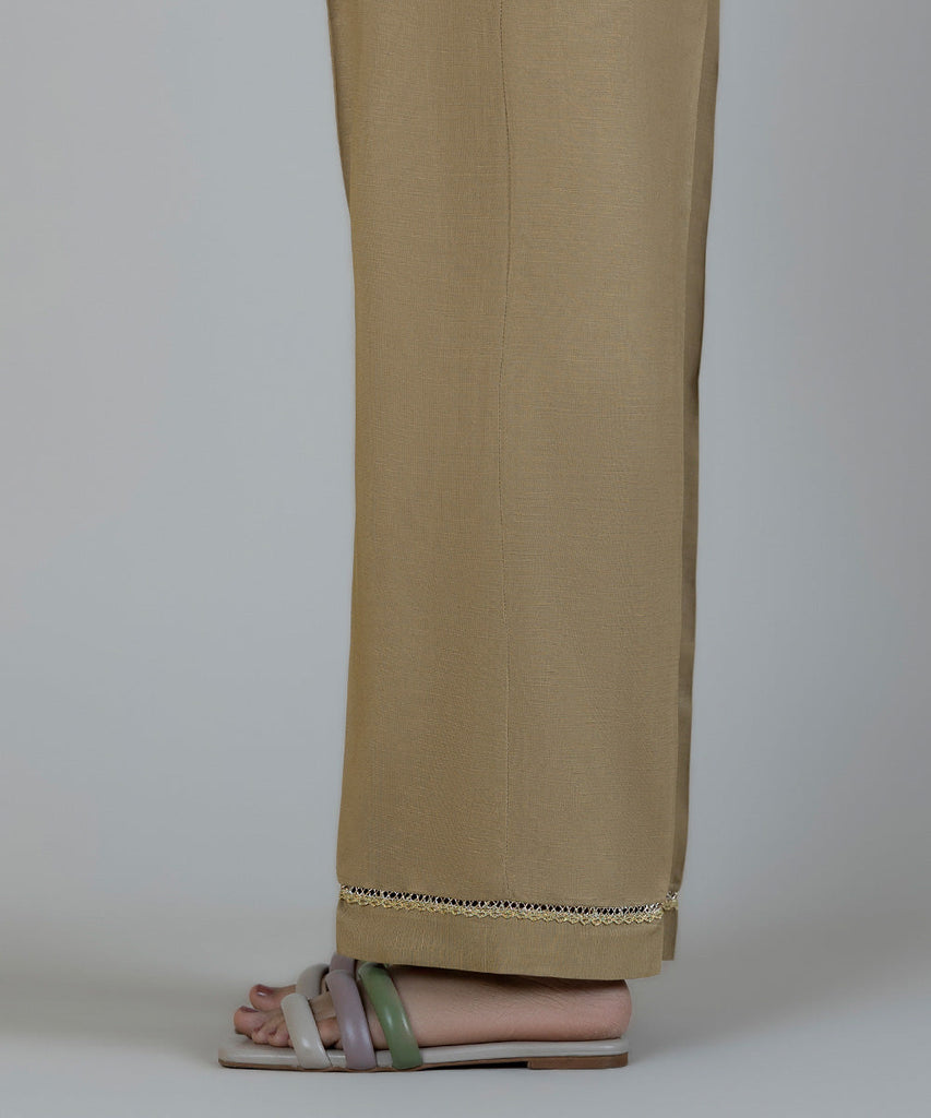 Complete your outfit with our camel brown straight pants with lace detailing.