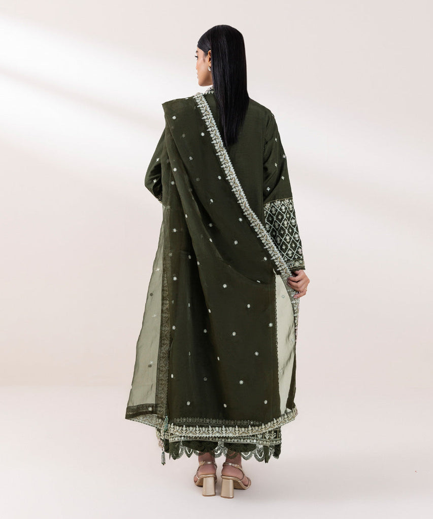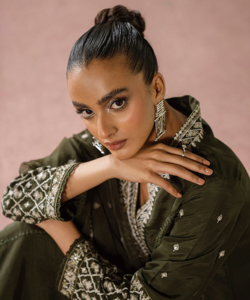 Curate the perfect festive 'fit with our three-piece embroidered olive green suit, featuring an A-line shirt with a V-neckline, dyed culottes, and blended organza dupatta with tassels.