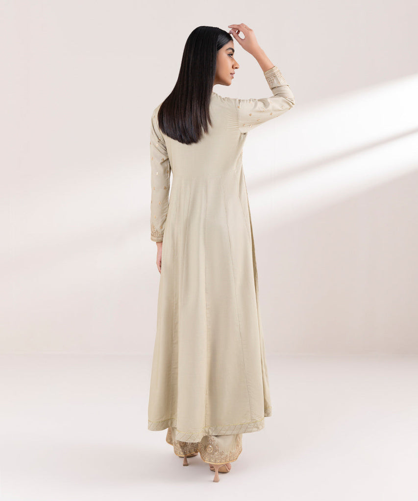 Elevate your festive style with our khaki embroidered pishwas featuring a V-neckline.