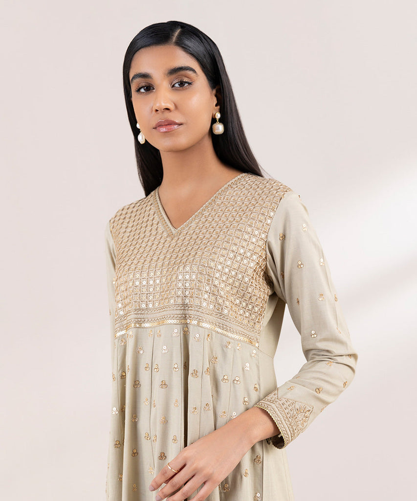 PishwasElevate your festive style with our khaki embroidered pishwas featuring a V-neckline. Details: Dyed Front with...