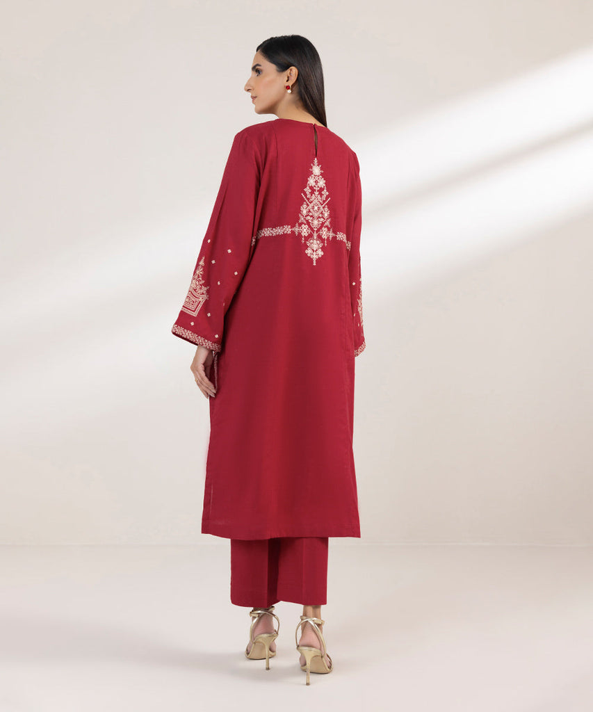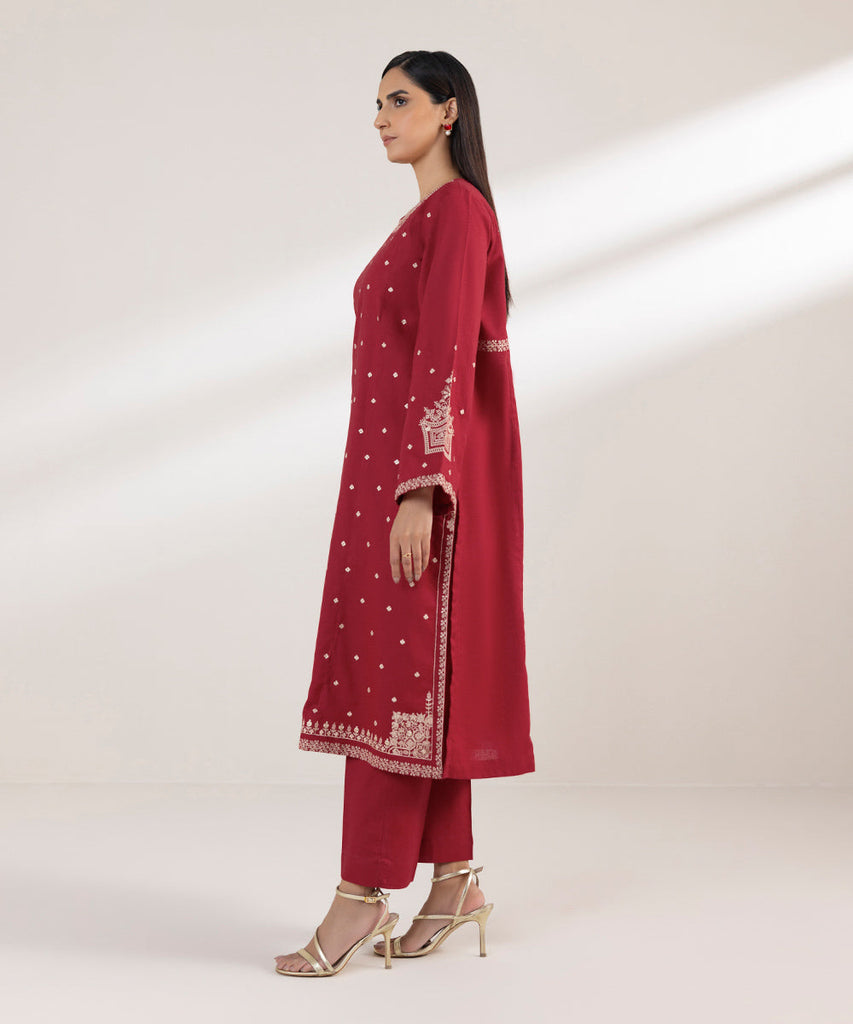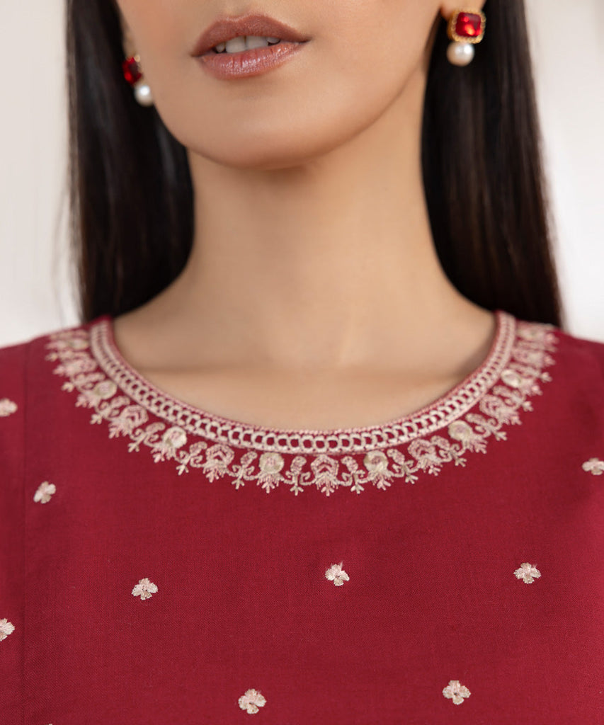Curate a classy festive look in our deep red, long A-line cotton linen shirt featuring embroidery.