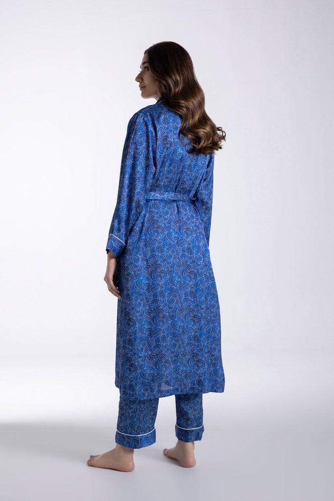 Lounge around in this luxurious and comfortable printed satin robe in navy with a shawl collar, contrast piping, a tie belt and side pockets.