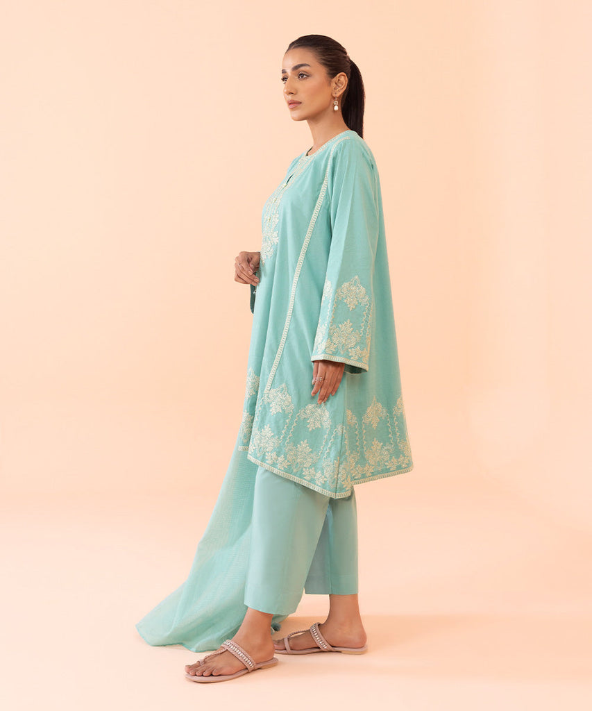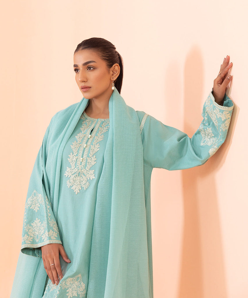 3-Piece A-Line Shirt with Trousers & Dupatta Elevate your style with our light blue embroidered A-line paired wit...