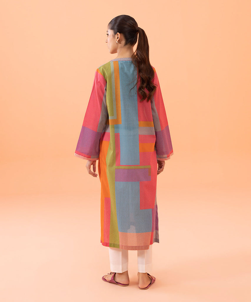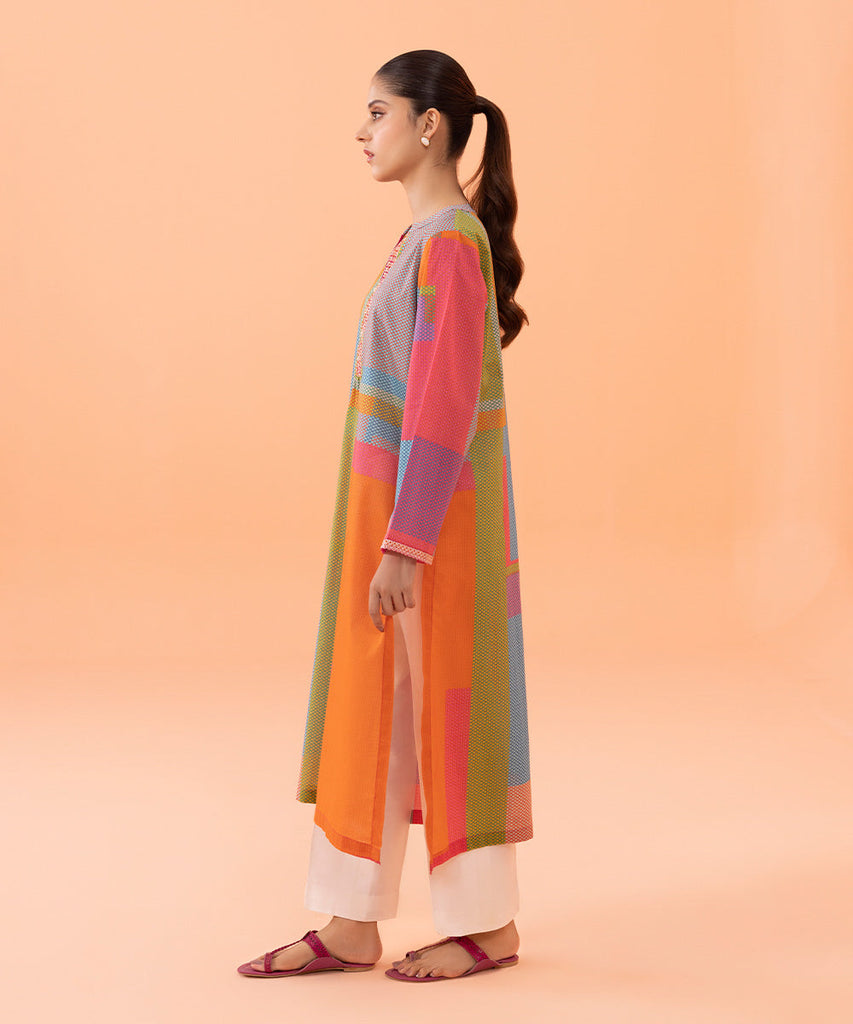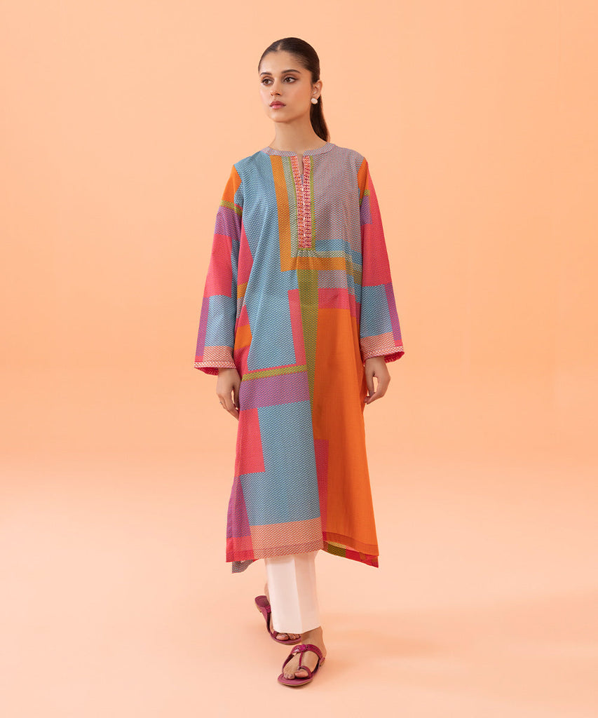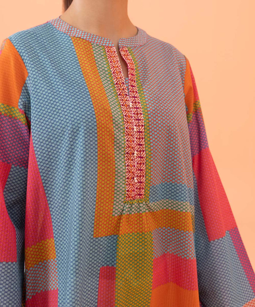 Printed Embroidered Front, Printed Back, Full Embroidered Printed Sleeves, Band Neckline With Slit