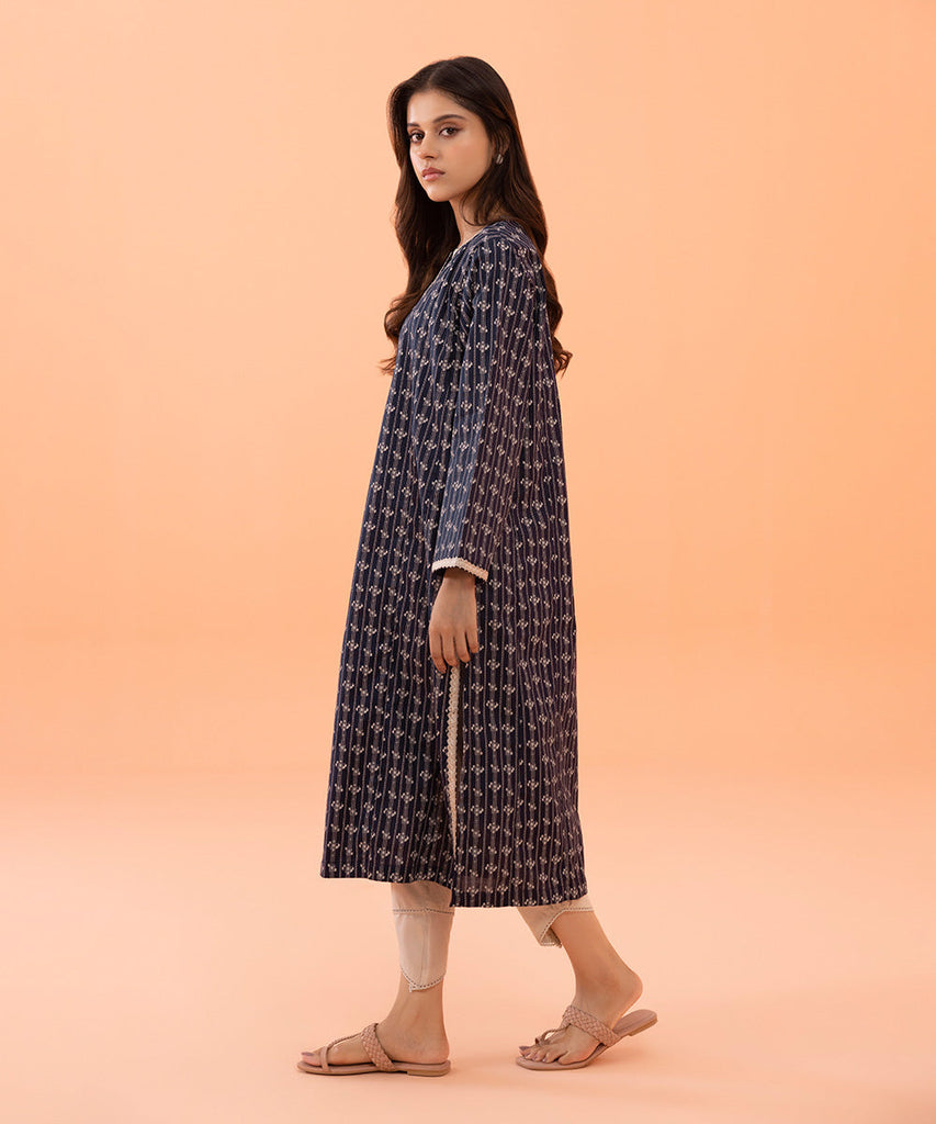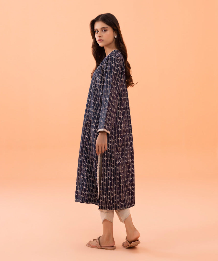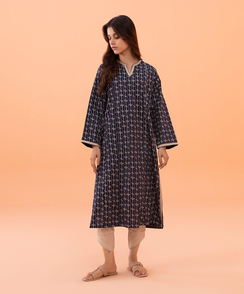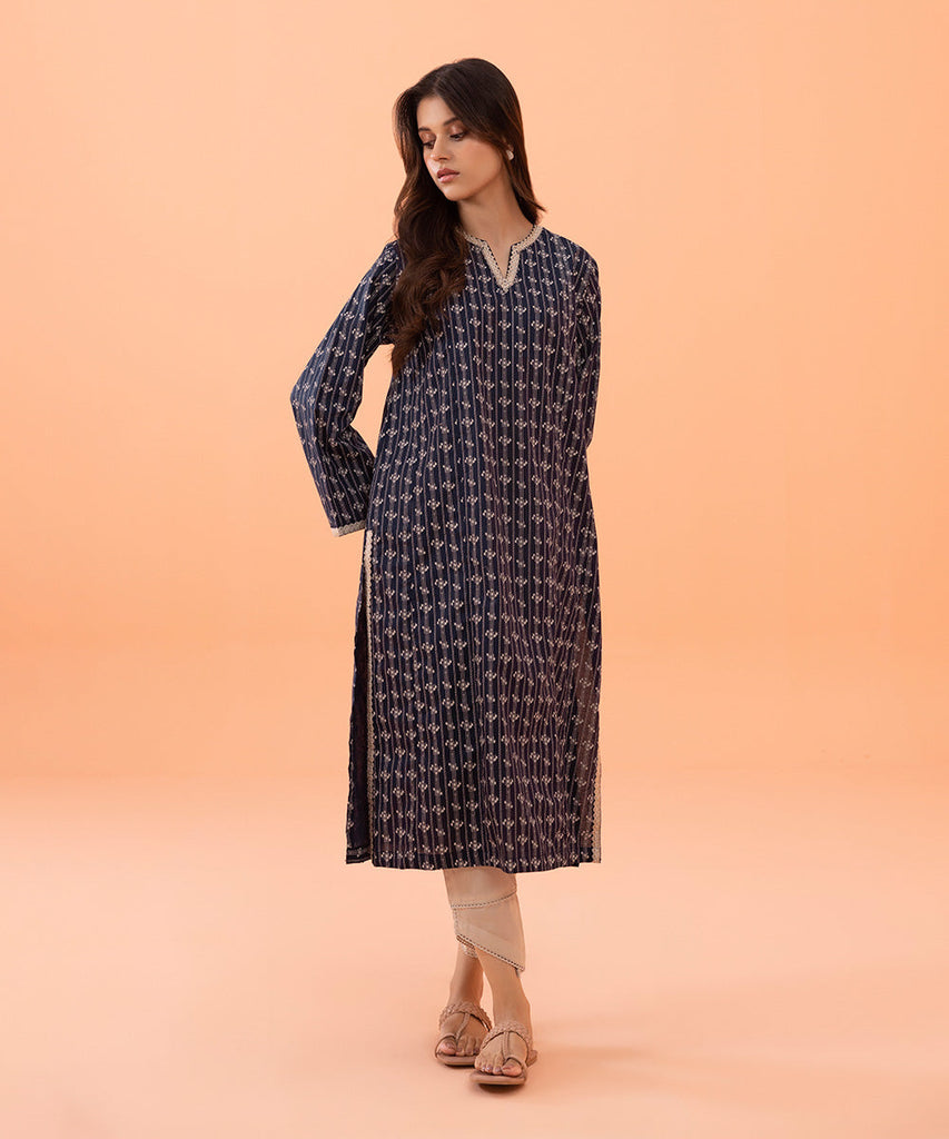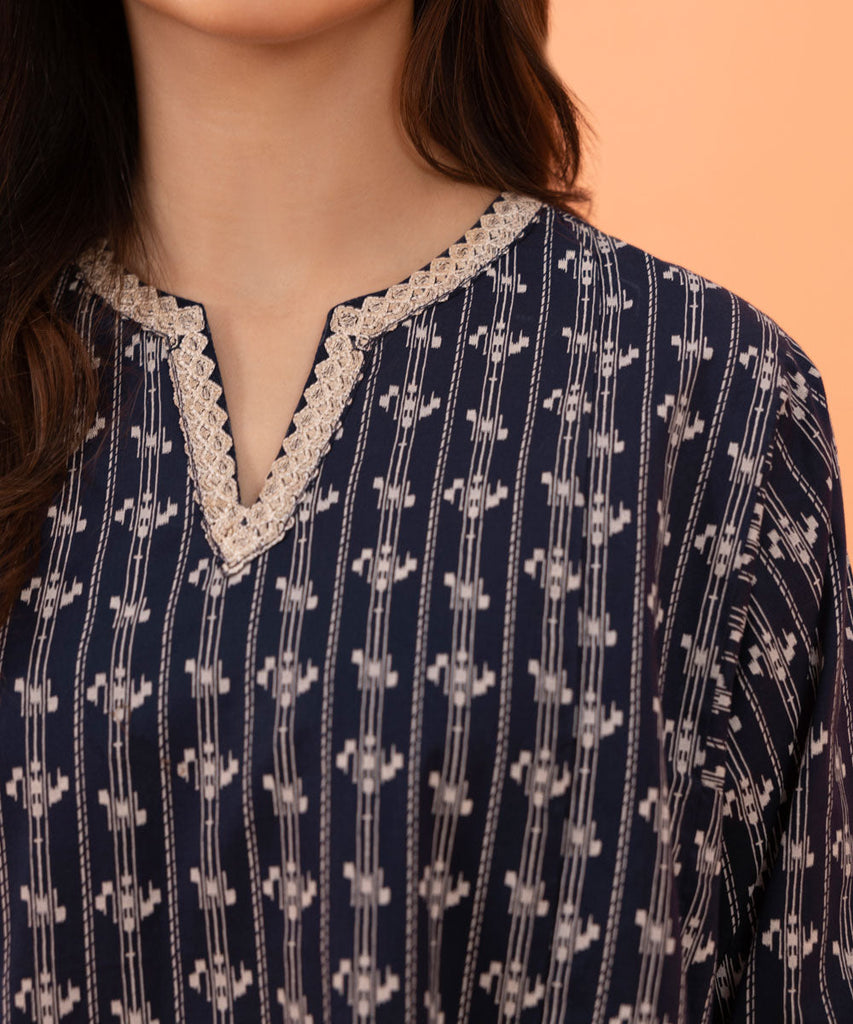 Printed Embroidered Front, Printed Back, Full Embroidered Printed Sleeves, Round Neckline With Slit