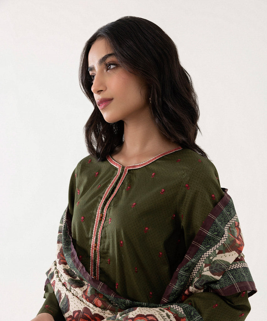 Elevate your style with our green straight dobby silhouette paired with a printed dupatta and straight pants.