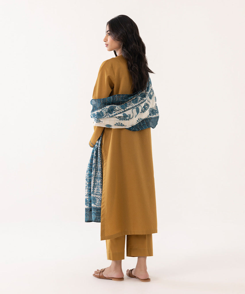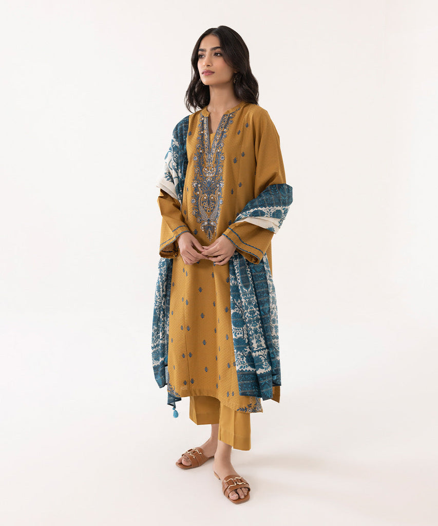 Elevate your style with our mustard straight dobby silhouette paired with a printed dupatta and straight pants.