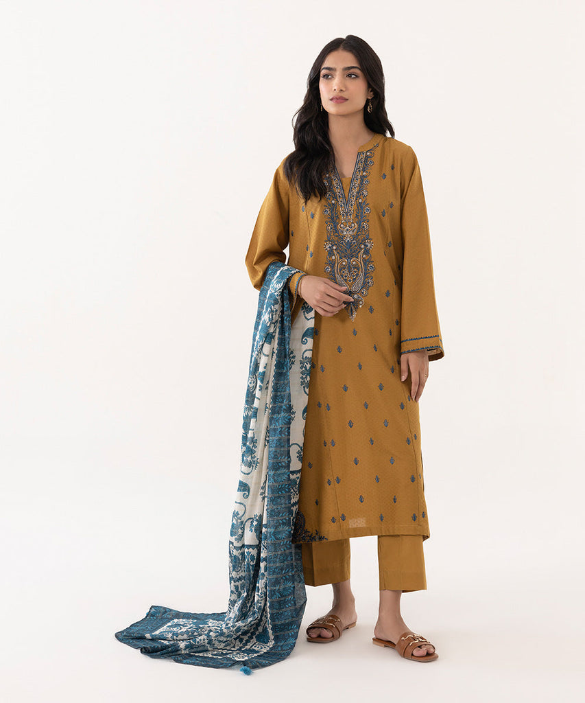 3-Piece Straight Kurta with Trousers & Dupatta Elevate your style with our mustard straight dobby silhouette pair...