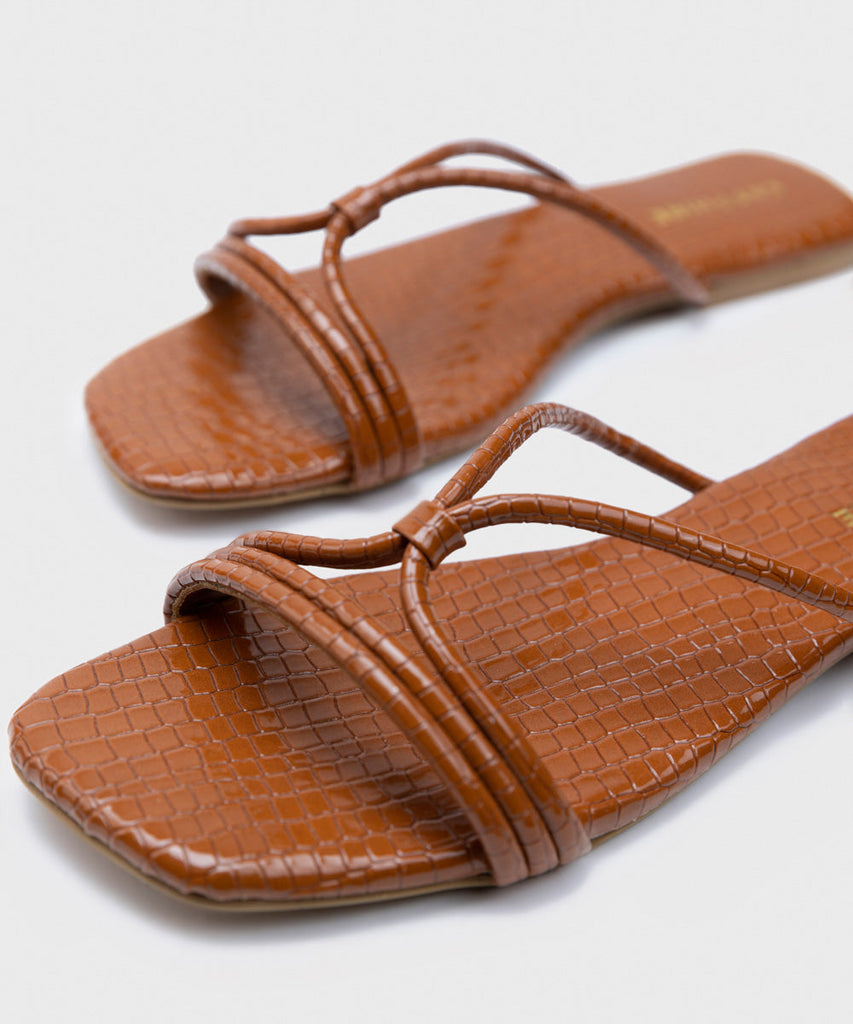 Elevate your style with our tan square-toe slides with strappy upper.