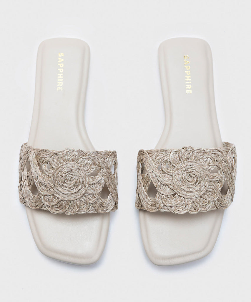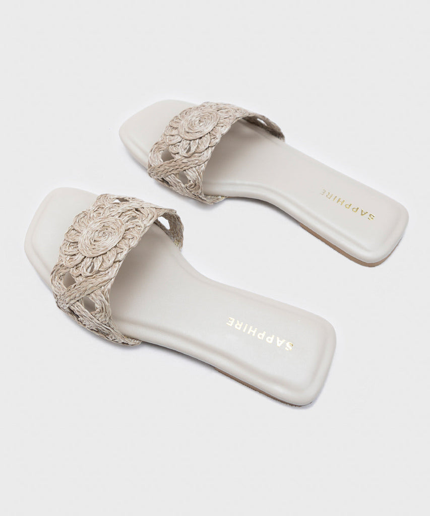 Elevate your look with our square-toe shaped beige jute flats with floral upper.