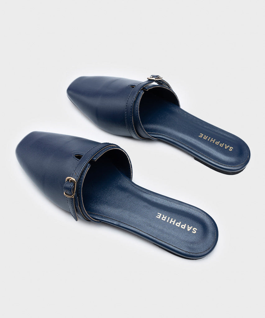 Elevate your outfit with our blue square-toe mules with metal pin buckle.