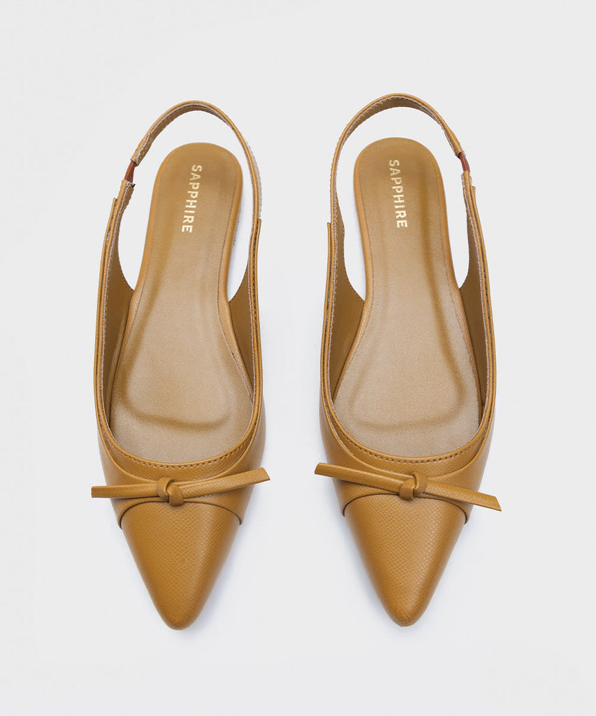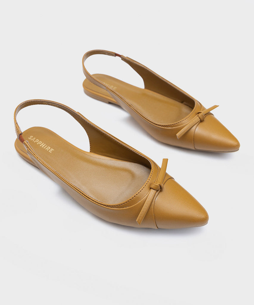 Flaunt your style with our mustard pointed toe flats with tiny top bow detail.