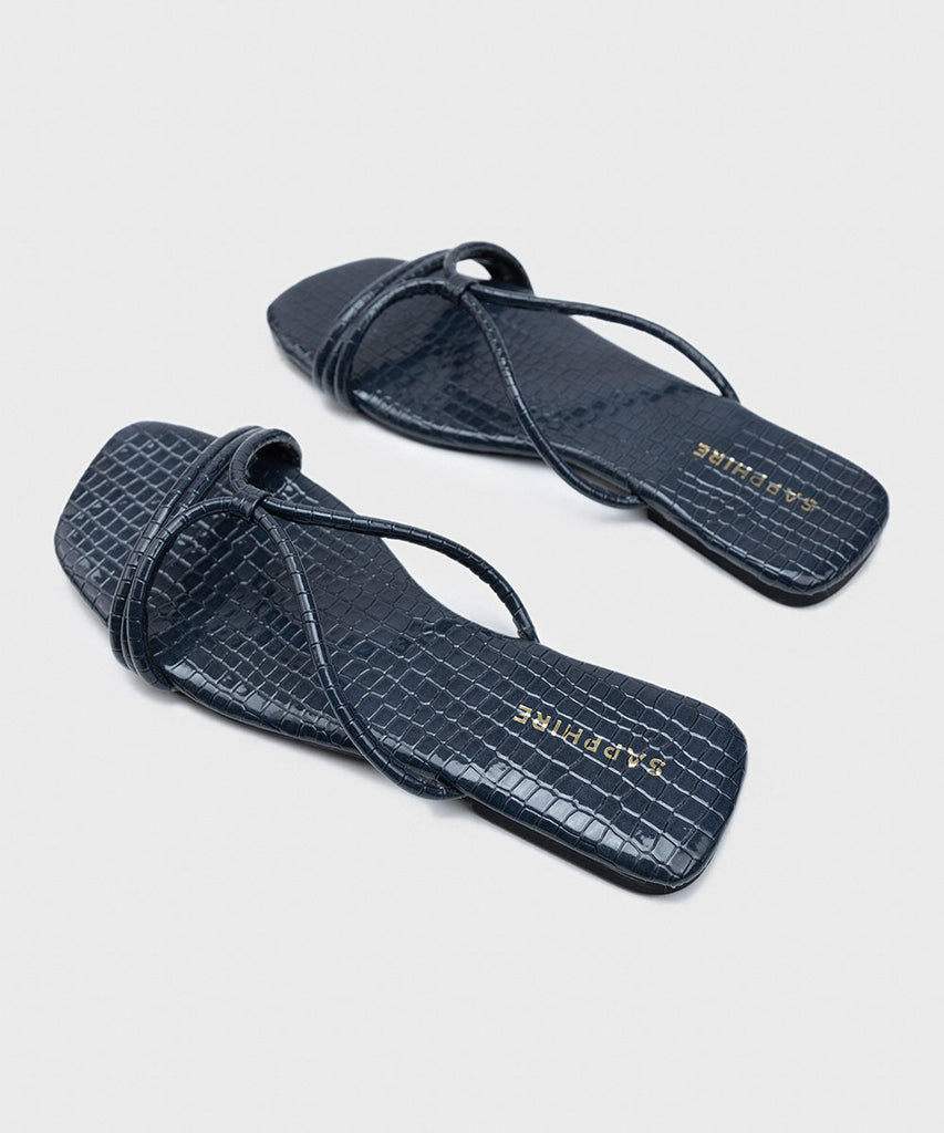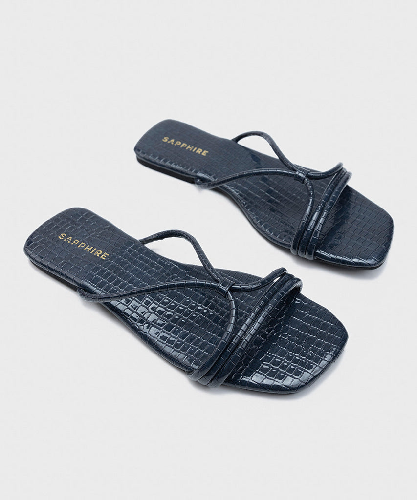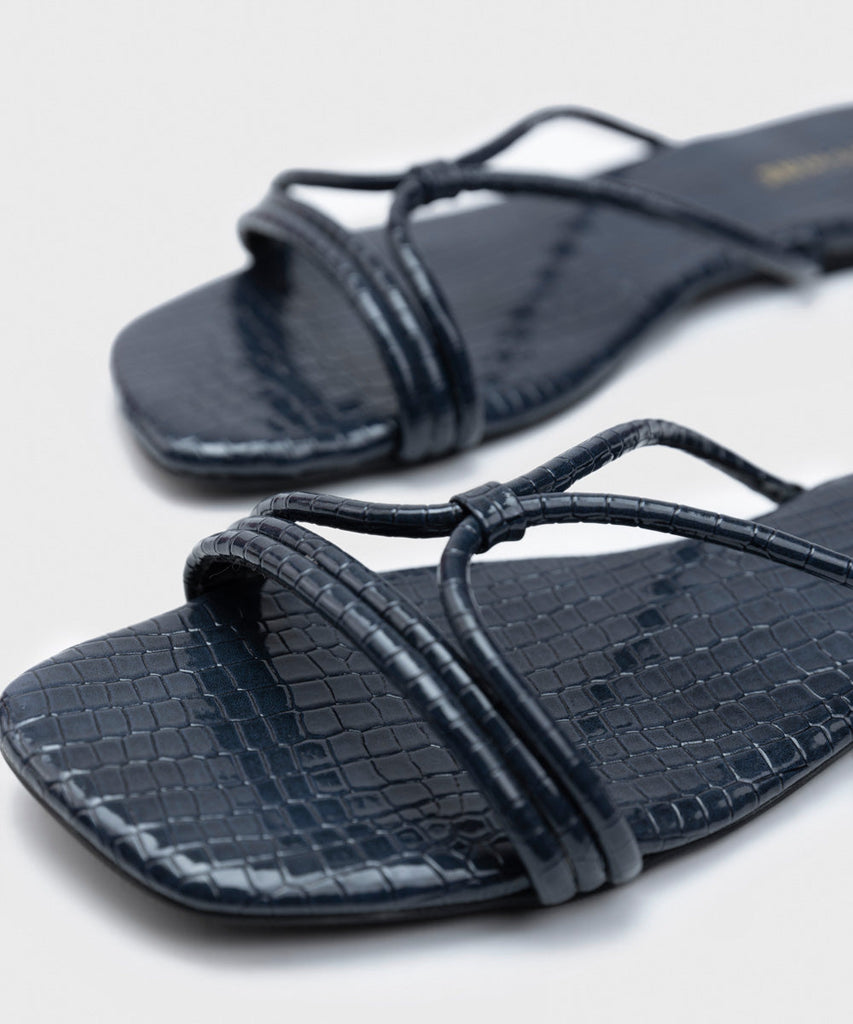 Elevate your style with our navy blue square-toe slides with strappy upper.