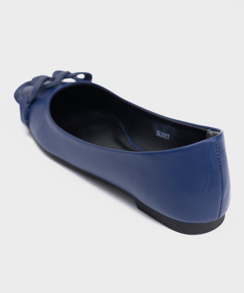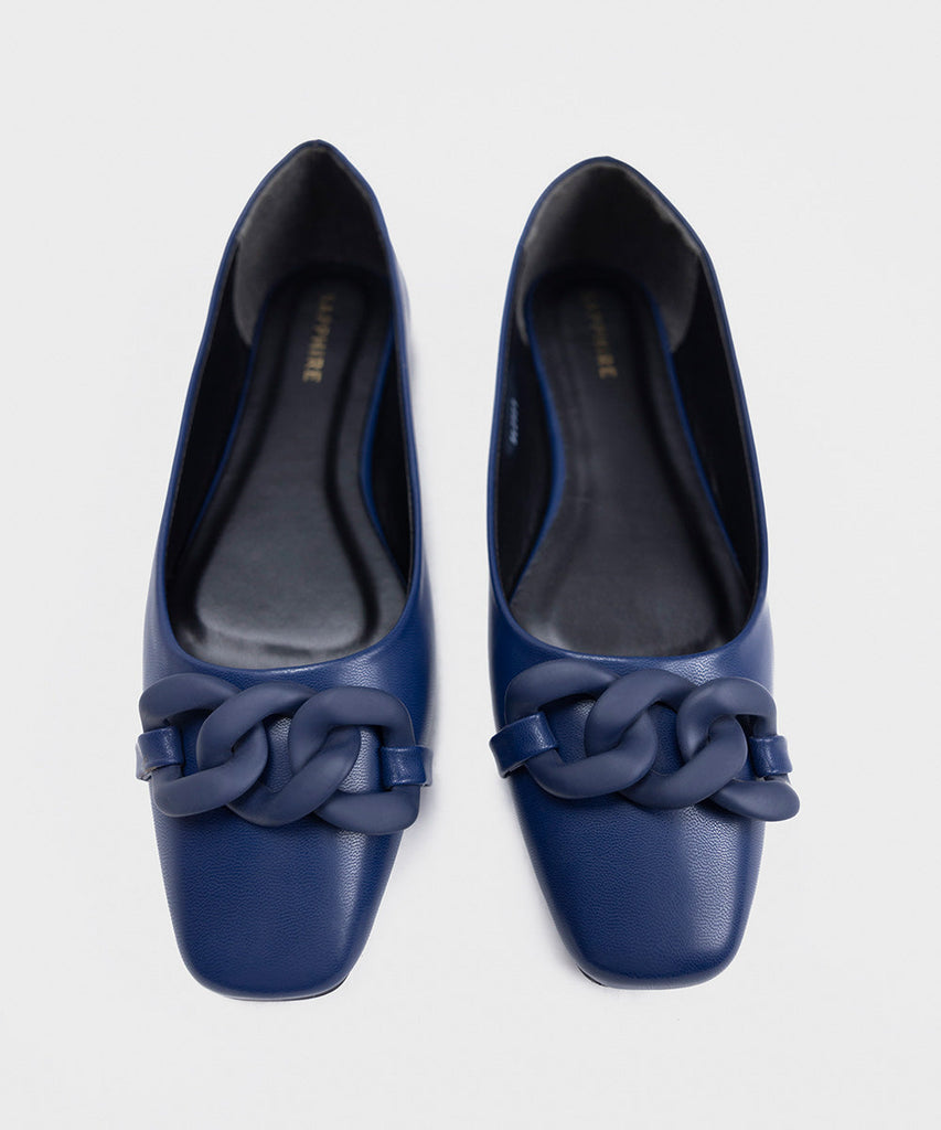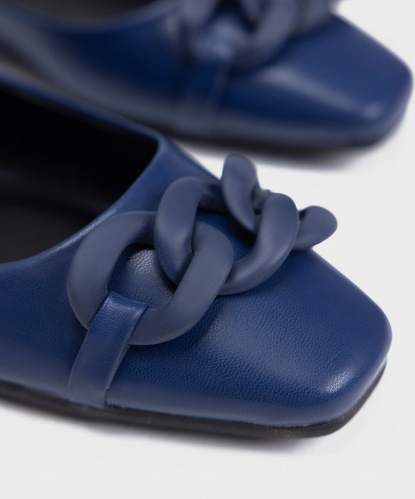 Elevate your outfit with our timeless navy pointed toe pumps with electroplated chain buckle on top.