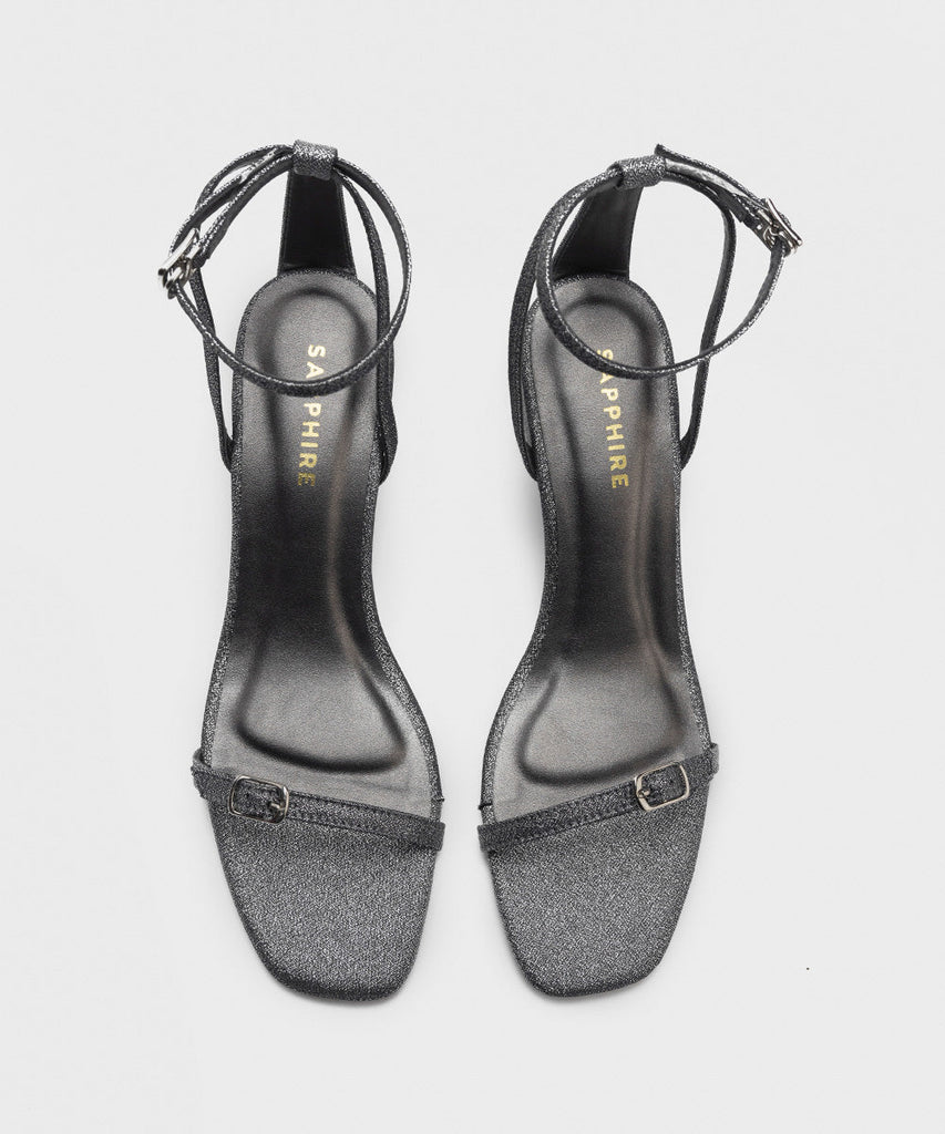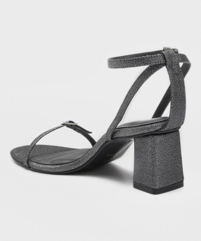 Our grey squared toe block heels feature shimmer faux leather upper with pin buckle detail.