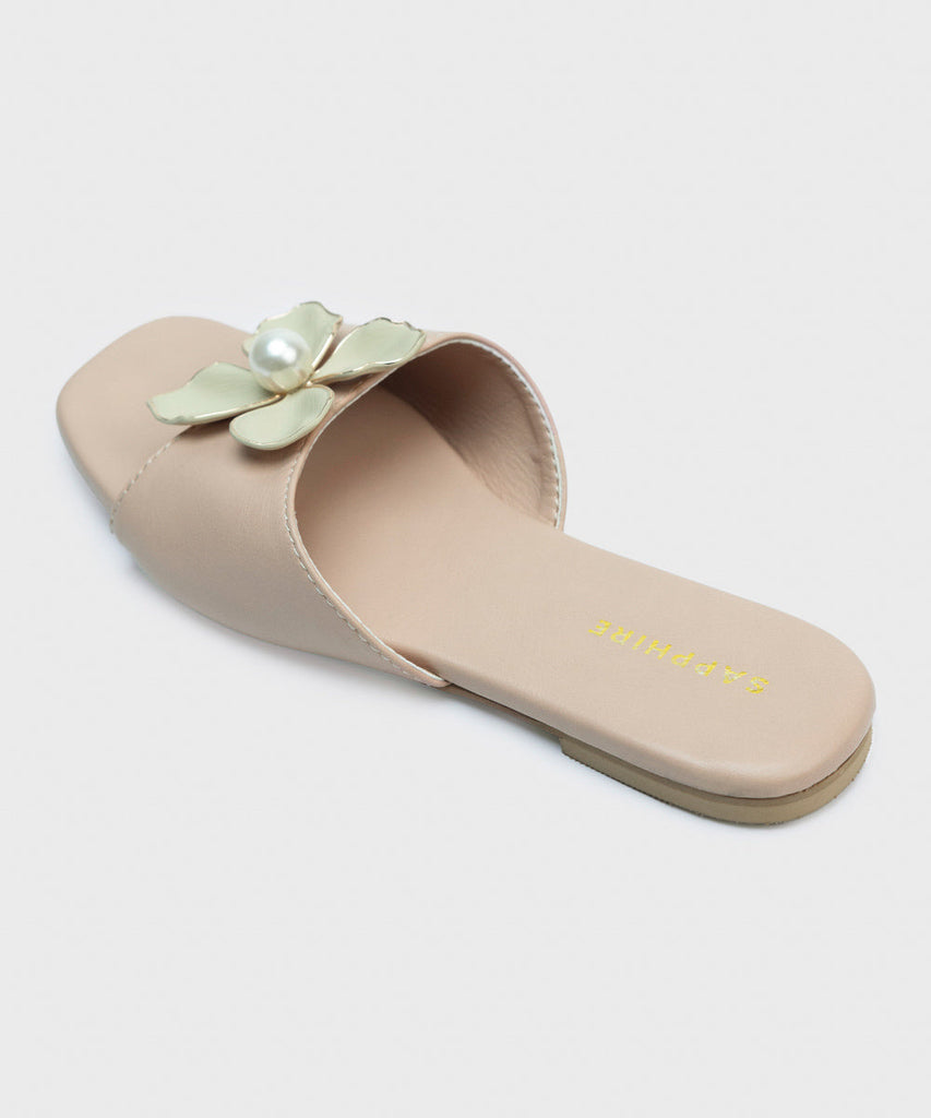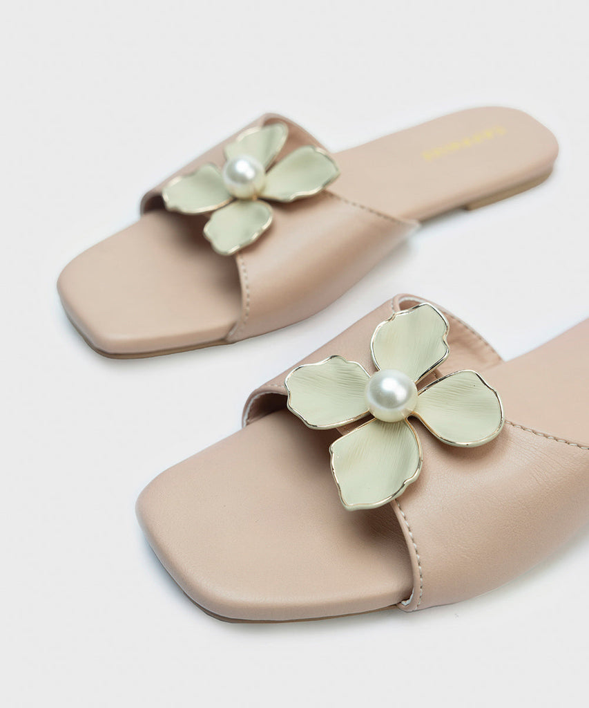 Step into spring in our light pink, square-toe flats with a flower on top.