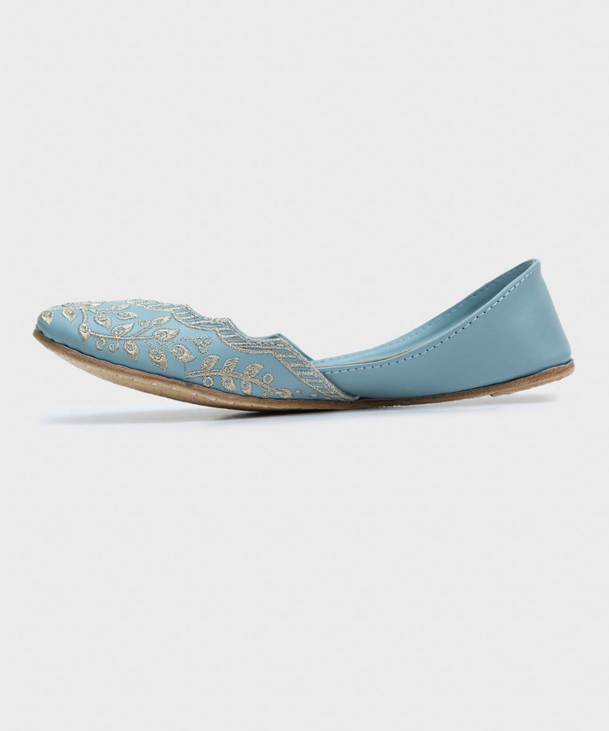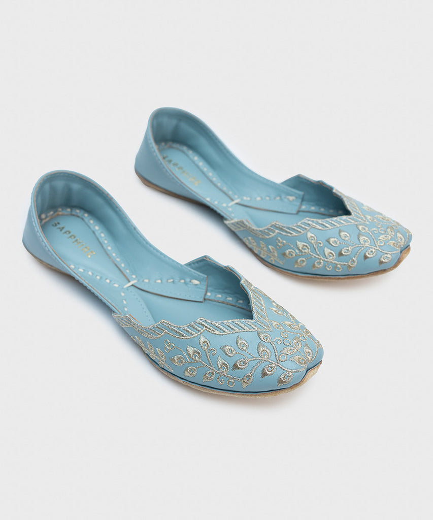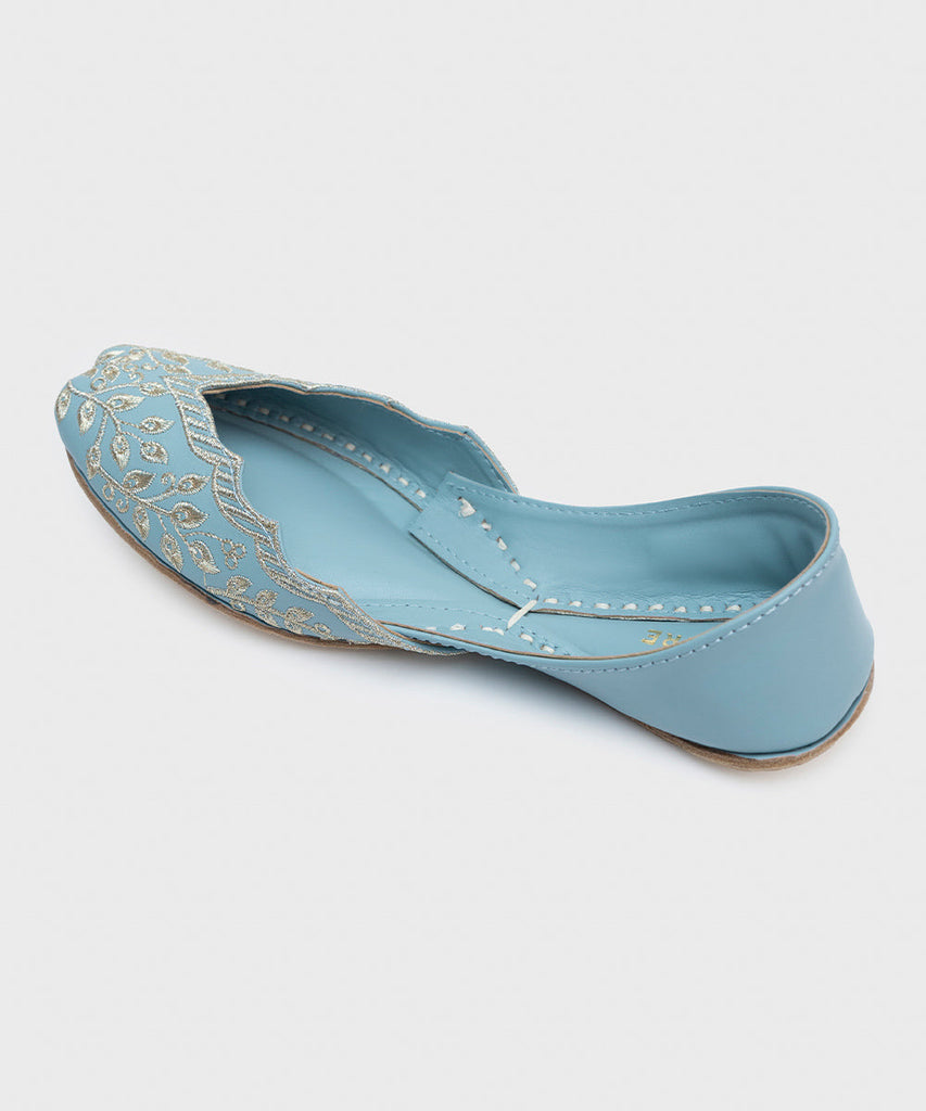 Keep it soft and subtle in our light blue embroidered khussas with embellishments.