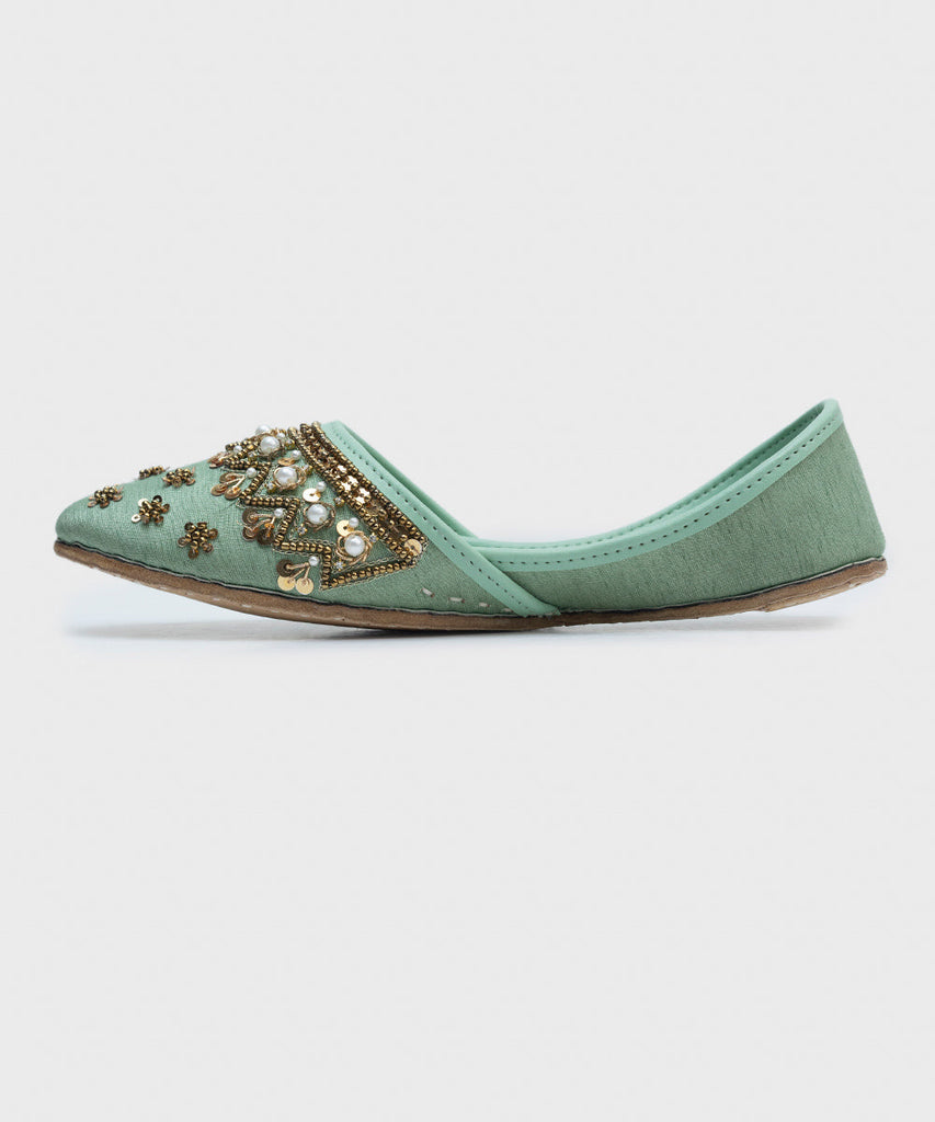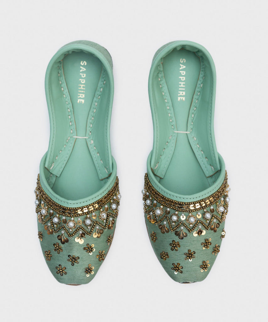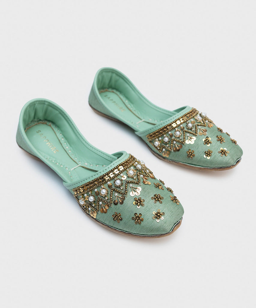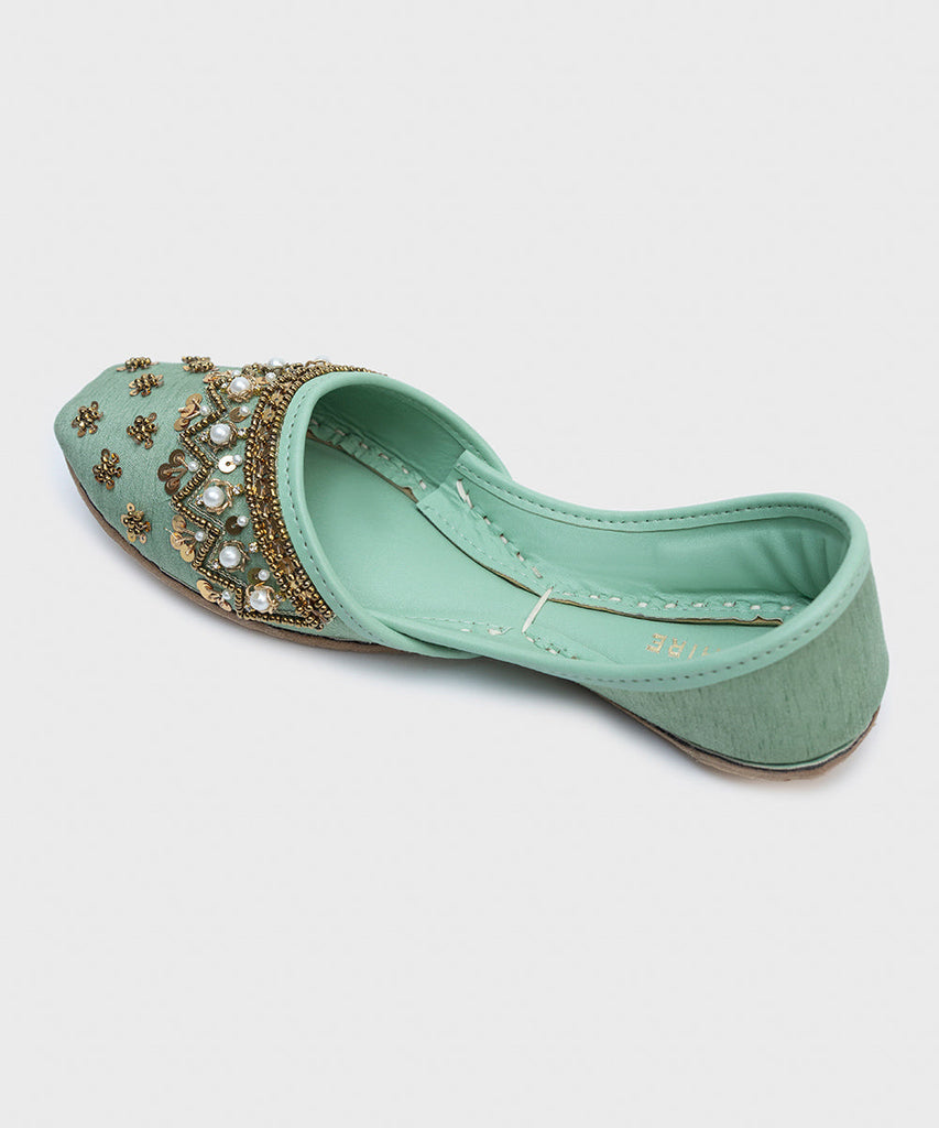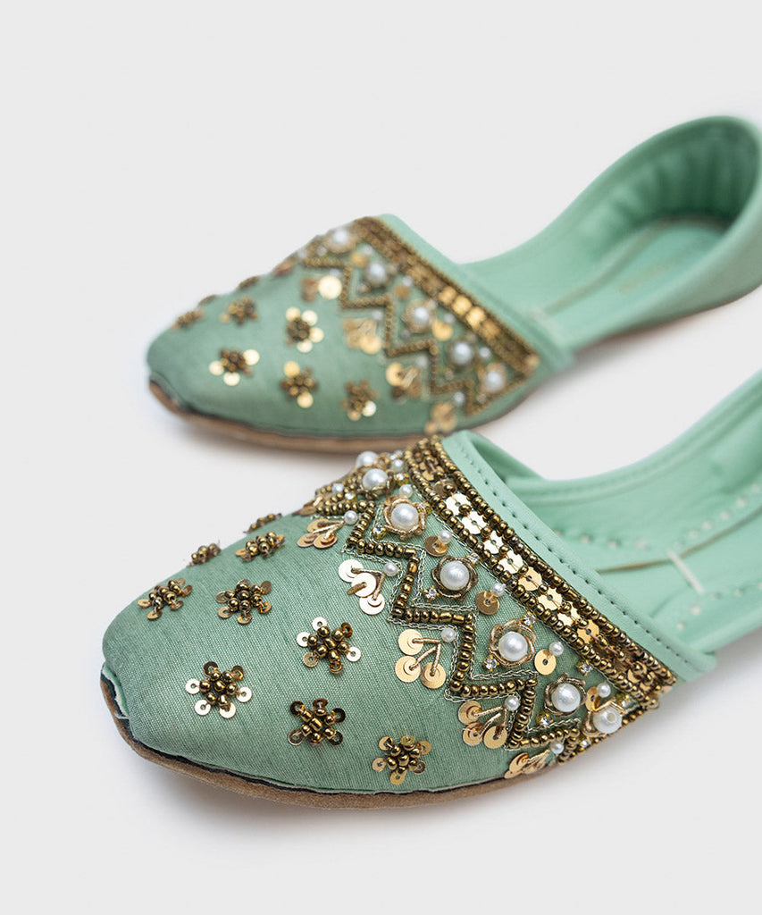Curate a dreamy festive look in our light green khussas with embellishments.