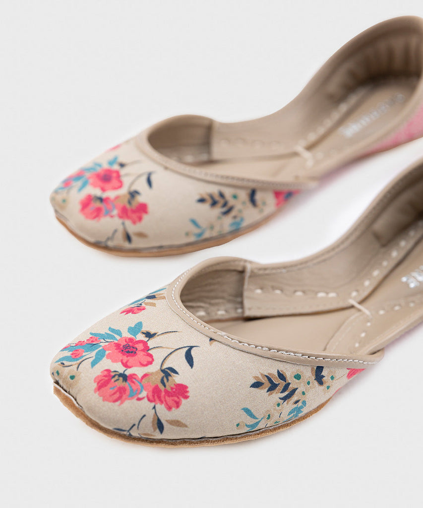 Uplift your outfit with our off white printed floral khussas. Details: Colour: Off White Material: Printed Cambric Wi...