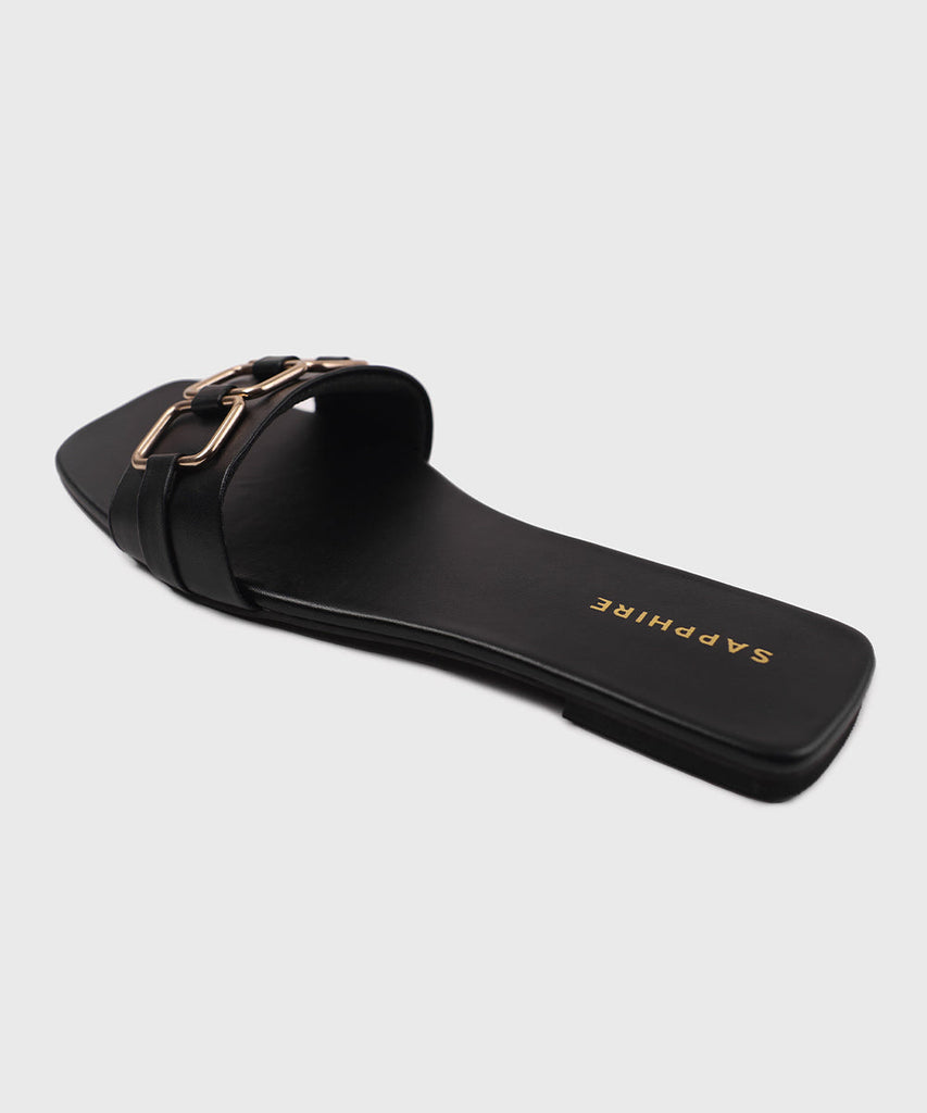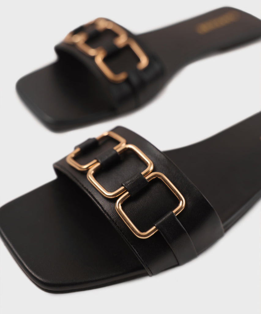 Elevate your everyday style with our black, square-toe flats with golden buckle detail on top.