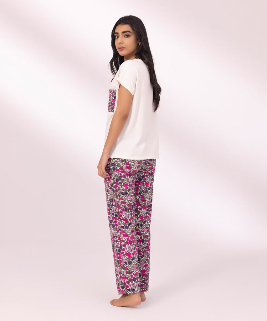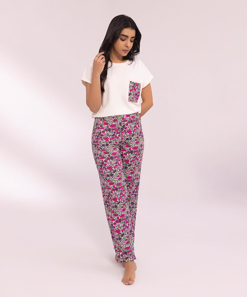 Round neck T-shirt with kimono sleeves and front printed pocket. Printed trousers with elasticated waistband and turn...