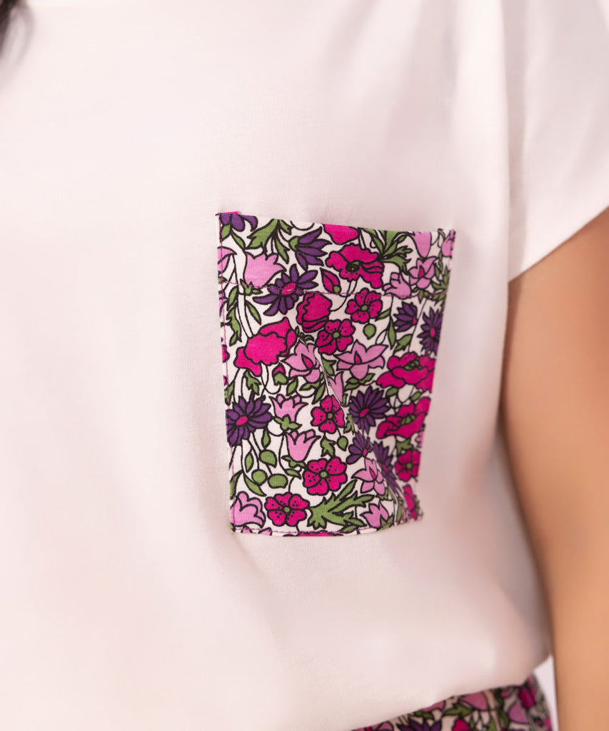 Round neck T-shirt with kimono sleeves and front printed pocket. Printed trousers with elasticated waistband and turn up cuffs.