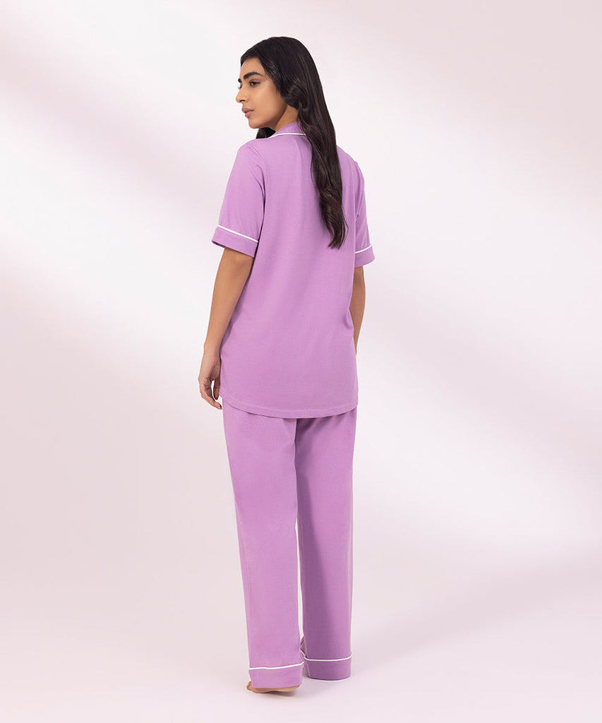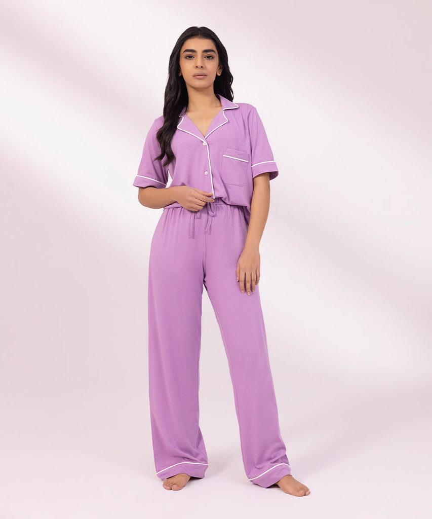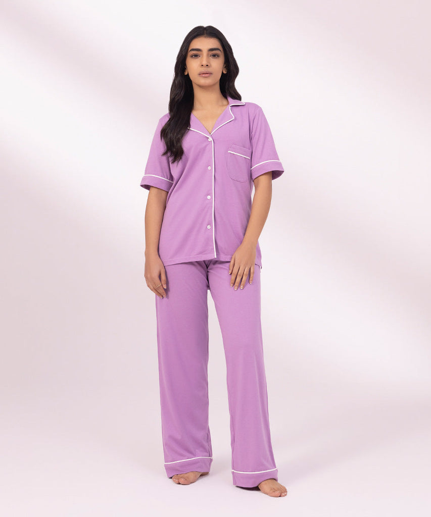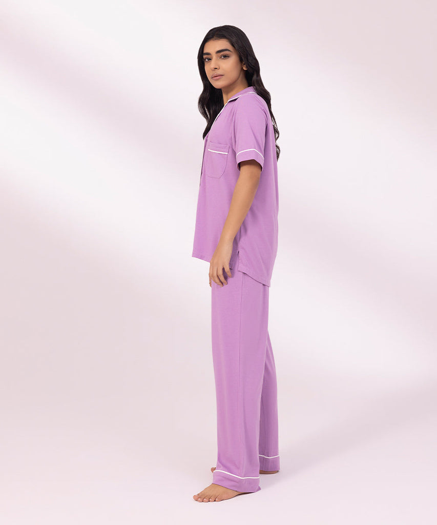 Solid PJ set in soft knitted fabric. Notch collar and button through opening with contrasting piping. Short sleeves w...