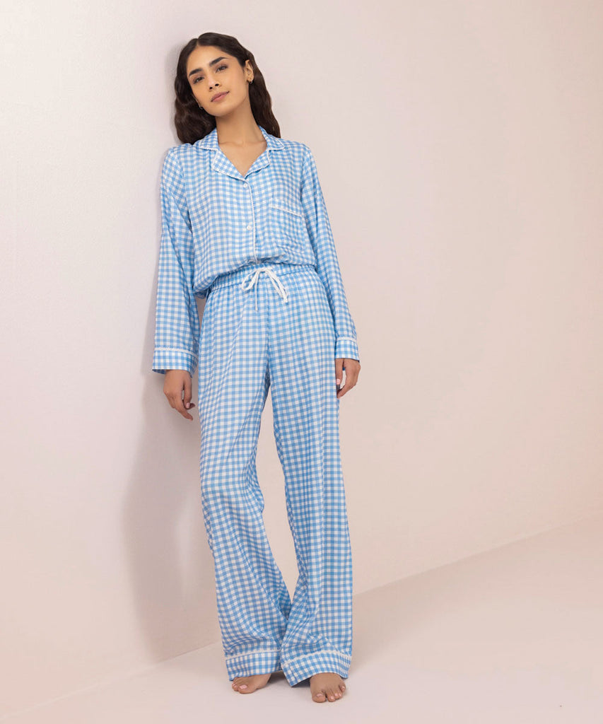 Printed PJ set in soft and breathable fabric. Notch collar and button through opening with lace detail. Full sleeves with back drop hem and front pocket. Loose fit trousers with fabric drawcord.