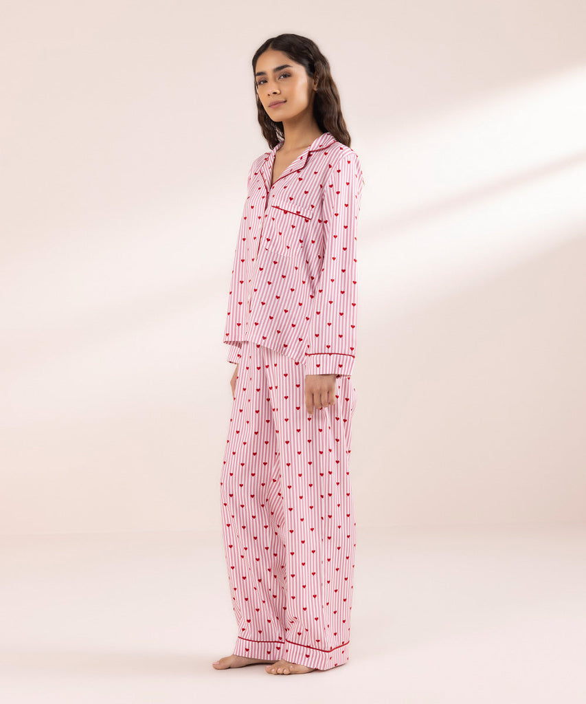 Printed PJ set in soft and breathable fabric. Notch collar and button through opening with contrasting piping. Full s...