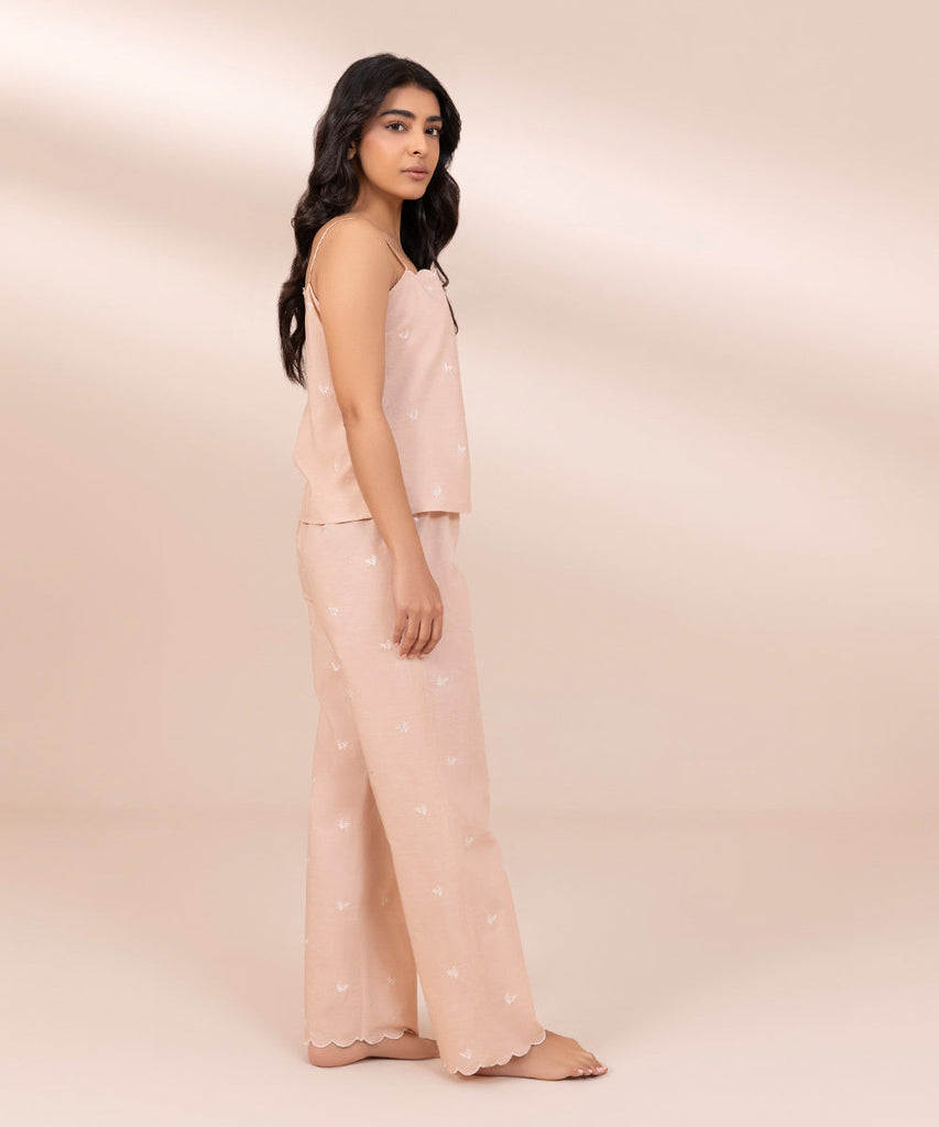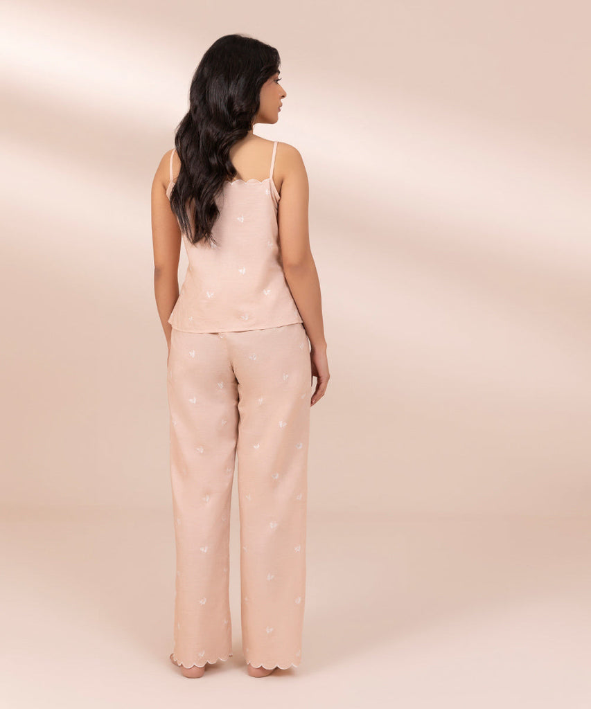 Embroidered PJ set in breathable fabric. Scalloped edge cami top with spaghetti straps. Loose fit trousers with scalloped hem and elasticated waistband.