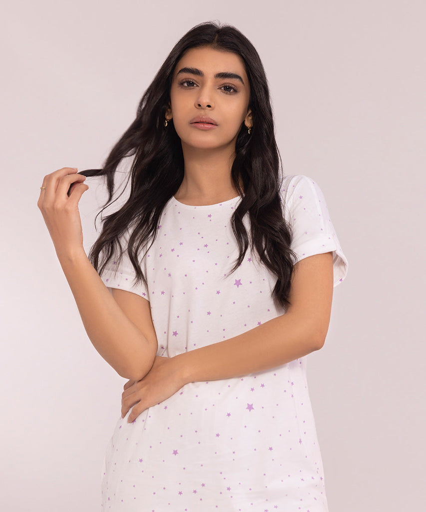 Loose fit printed T-shirt with round neck and kimono sleeves with turn up cuffs.