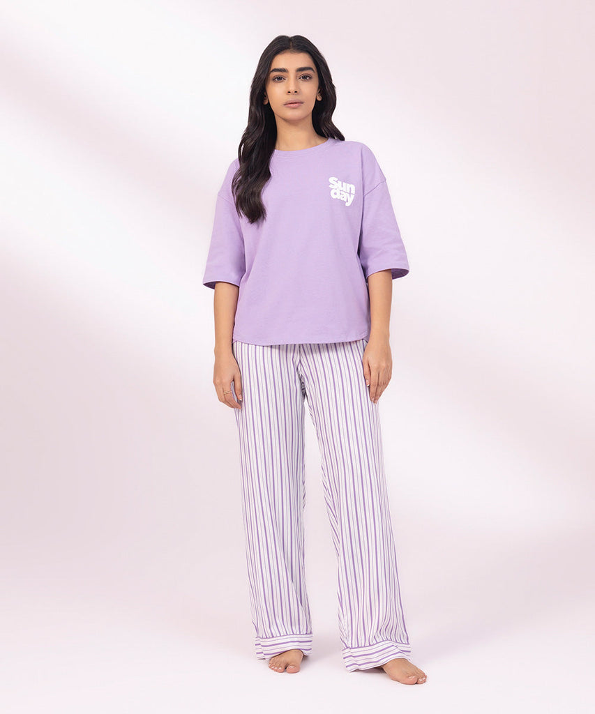 Round neck graphic T-shirt with short sleeves and round hemline with slit details. Details: Colour: Purple Fabric: 1...