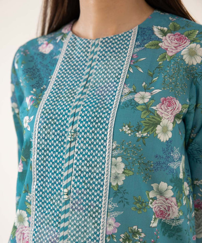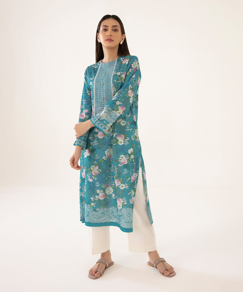 Printed Front With Embroidery On Neckline, Printed Back, Full Sleeves, Crew Neckline With Slit