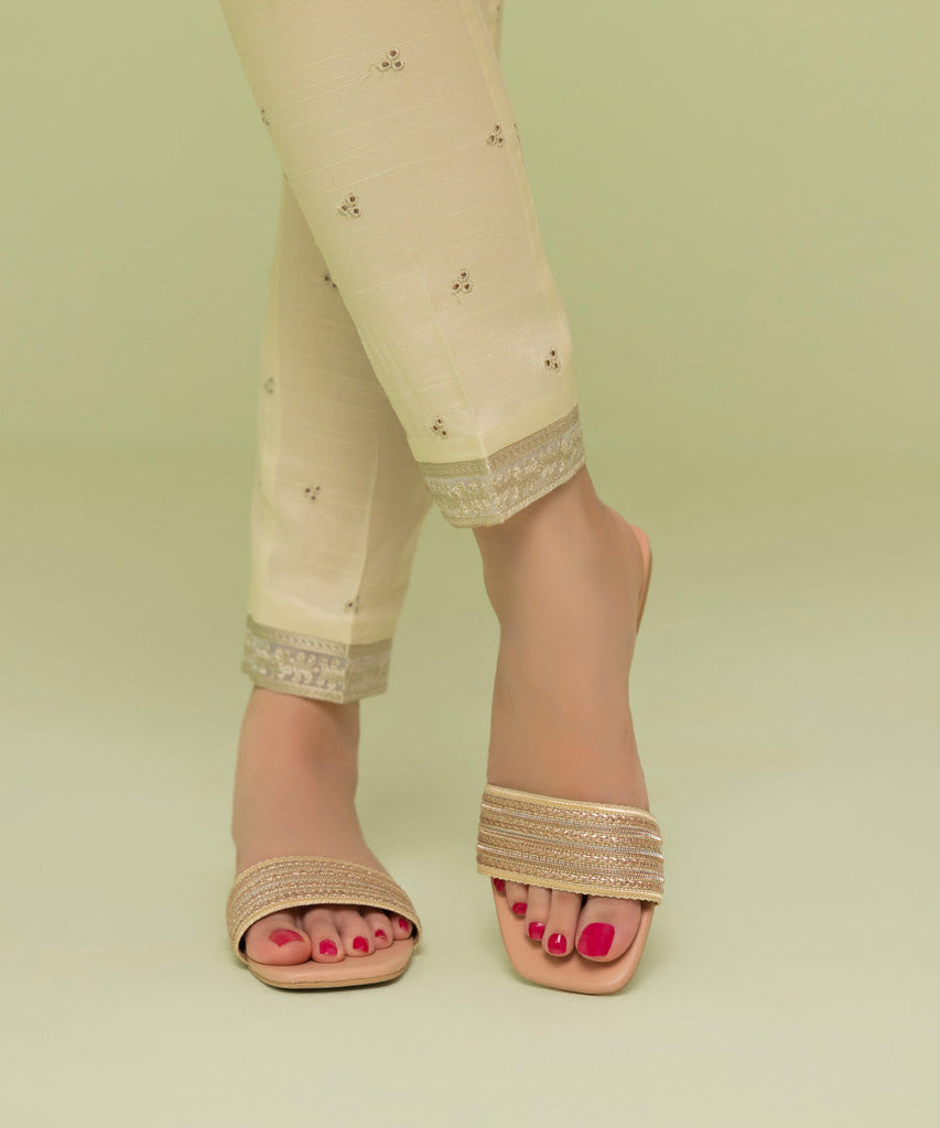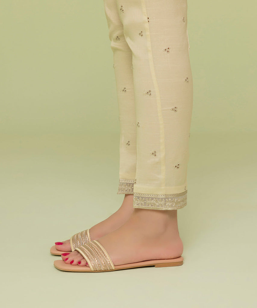 Elevate your outfit with our off white embroidered silk cigarette pants. Cigarette Pants Colour: Off White Fabric: Bl...