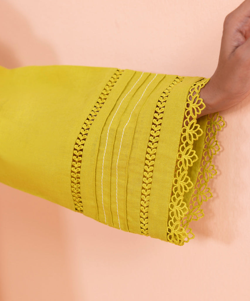 Our linen collection is perfect for the summer season. Opt for our green two-piece featuring an A-line shirt accented with sleeve detailing.