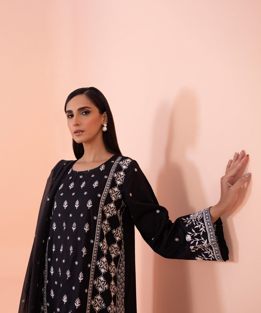 2-Piece A-Line Shirt with Dupatta Our black chikankari A-line silhouette features an exquisite karandi dupatta. Detai...