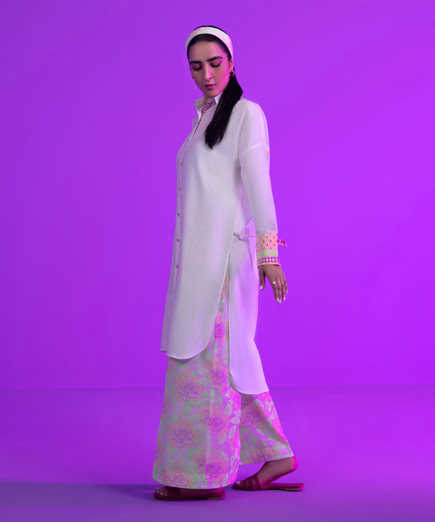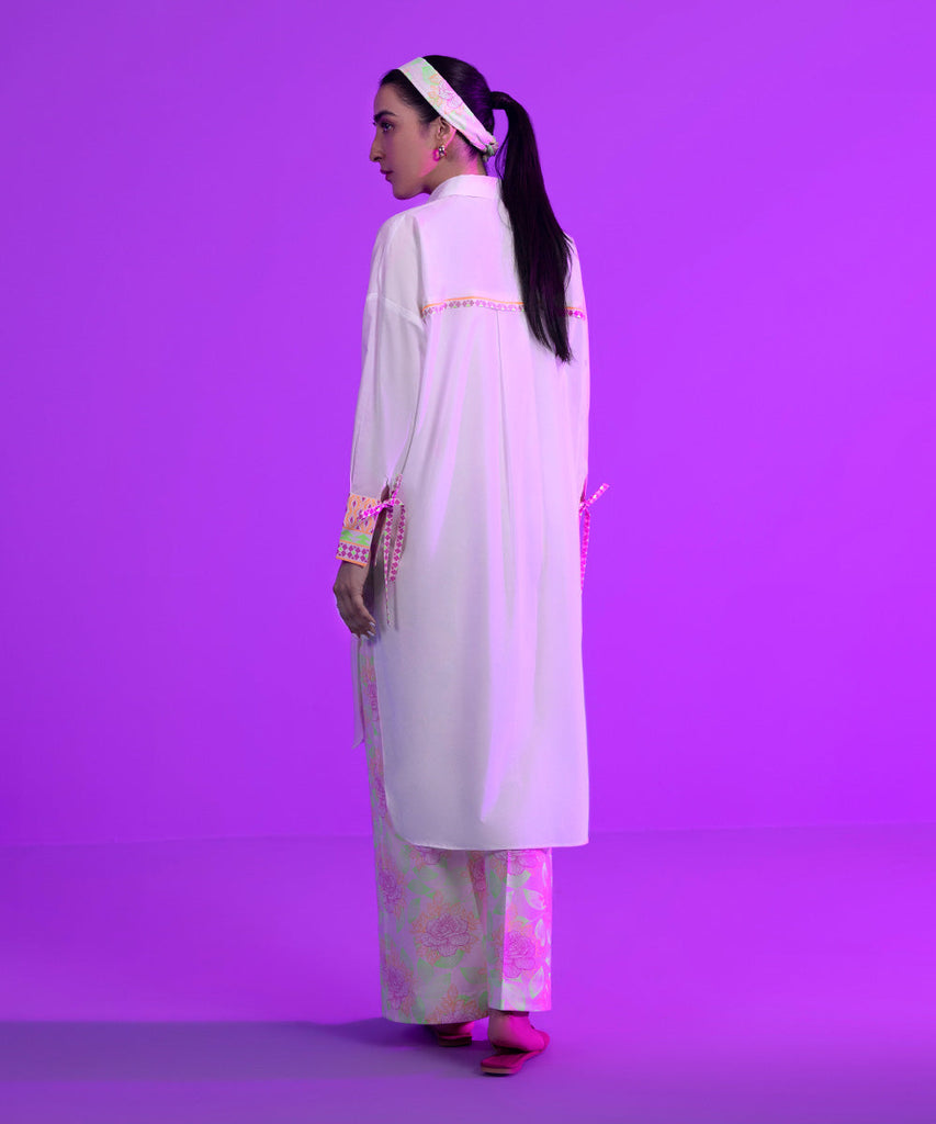 Make a solid statement in this off white straight silhouette featuring a collar neckline.