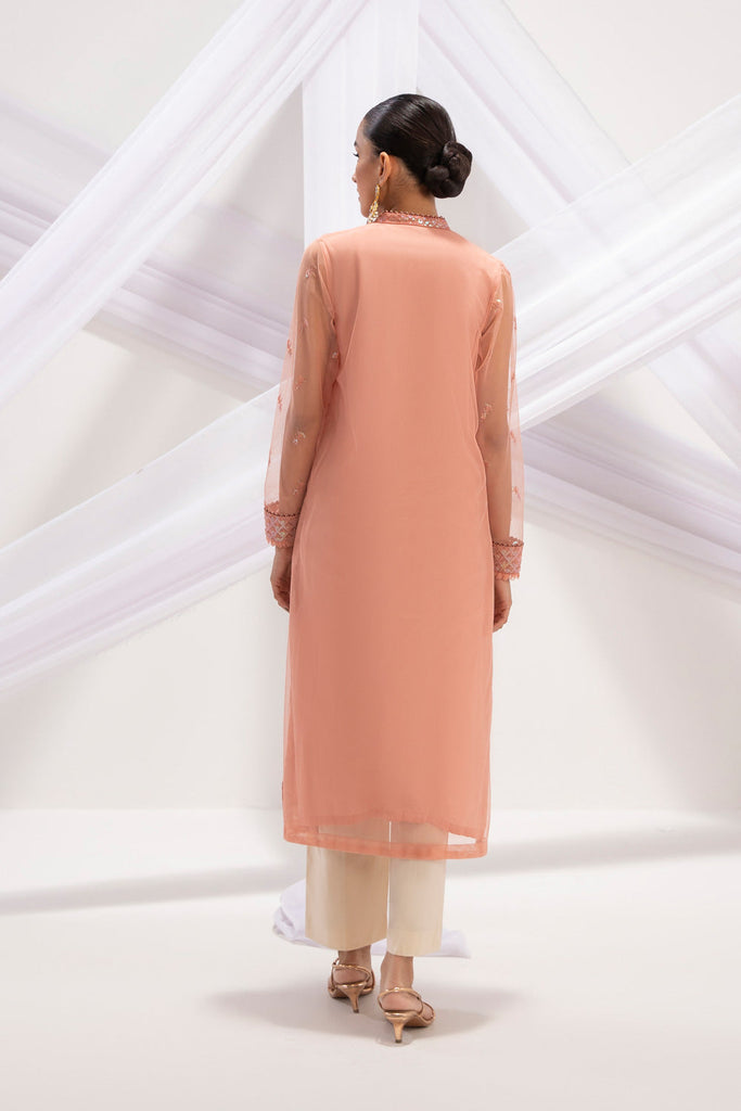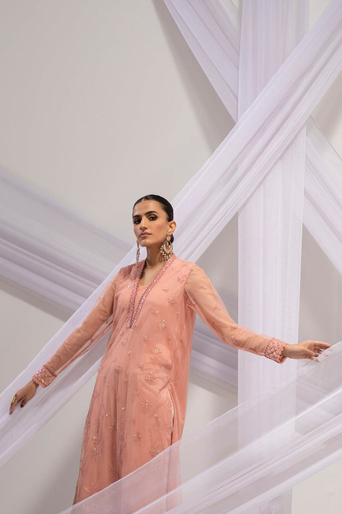 Refresh your wardrobe with soft hues of peach with this embroidered net A line silhouette.