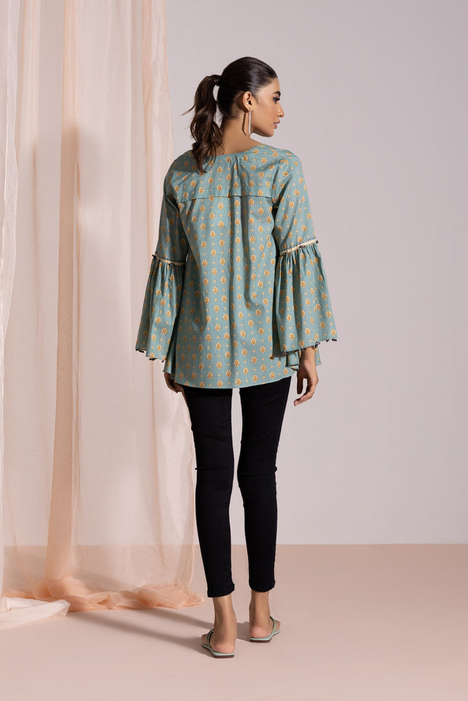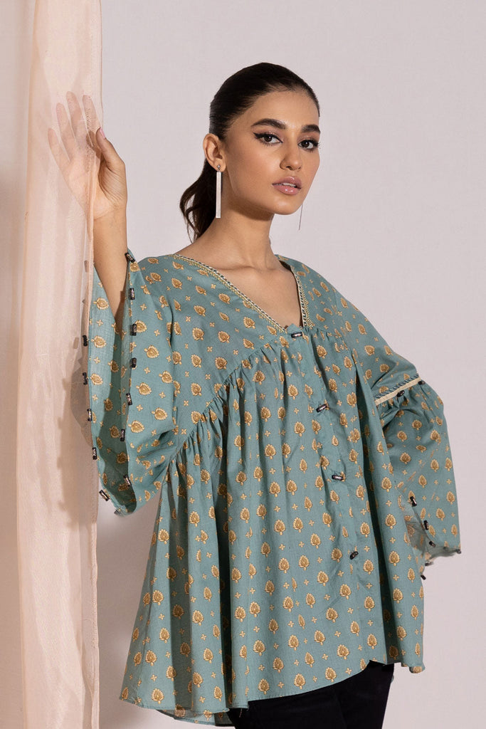 Twirl away in this green hued, printed fusion top with floral print.