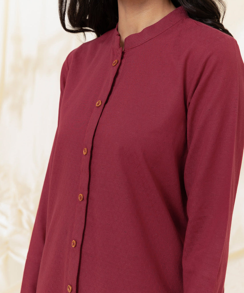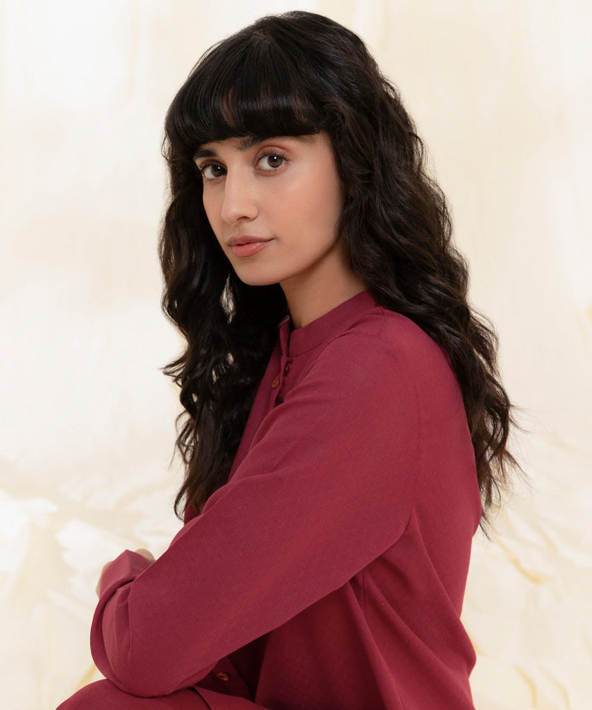 Our maroon button down silhouette represents our usage of recycled cotton to produce this collection.