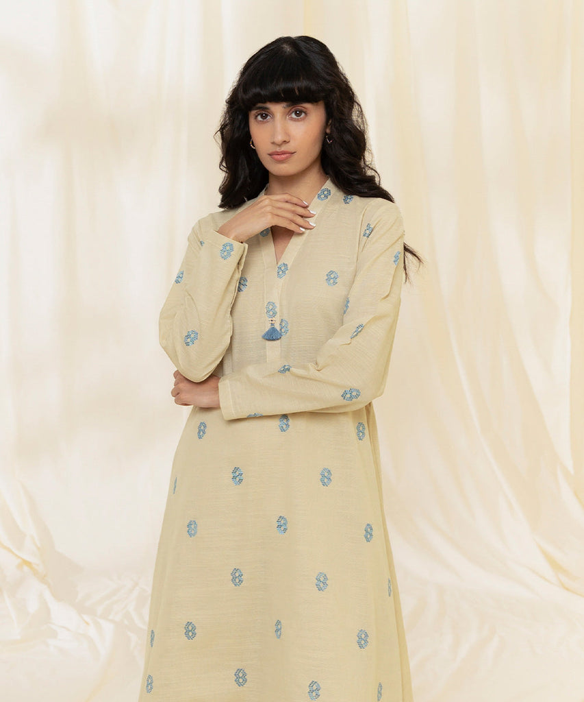 Dyed Front with Embroidery, Dyed Plain Back, Full Sleeves with Embroidery, V Neckline