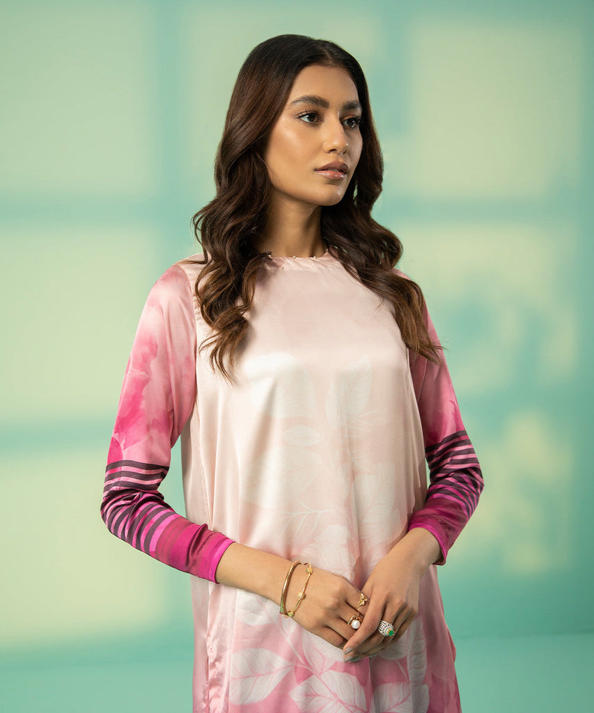 Create a contemporary look in this pink blended satin printed A-line shirt with a crew neckline.
