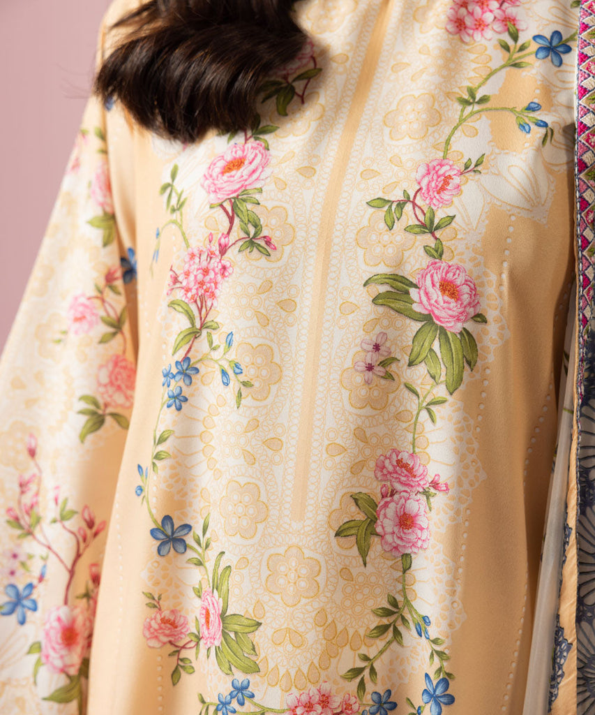 Immerse yourself in a floral fantasy this Eid, with this yellow silk silhouette featuring intricate patterns, crew neckline and a tissue dupatta.