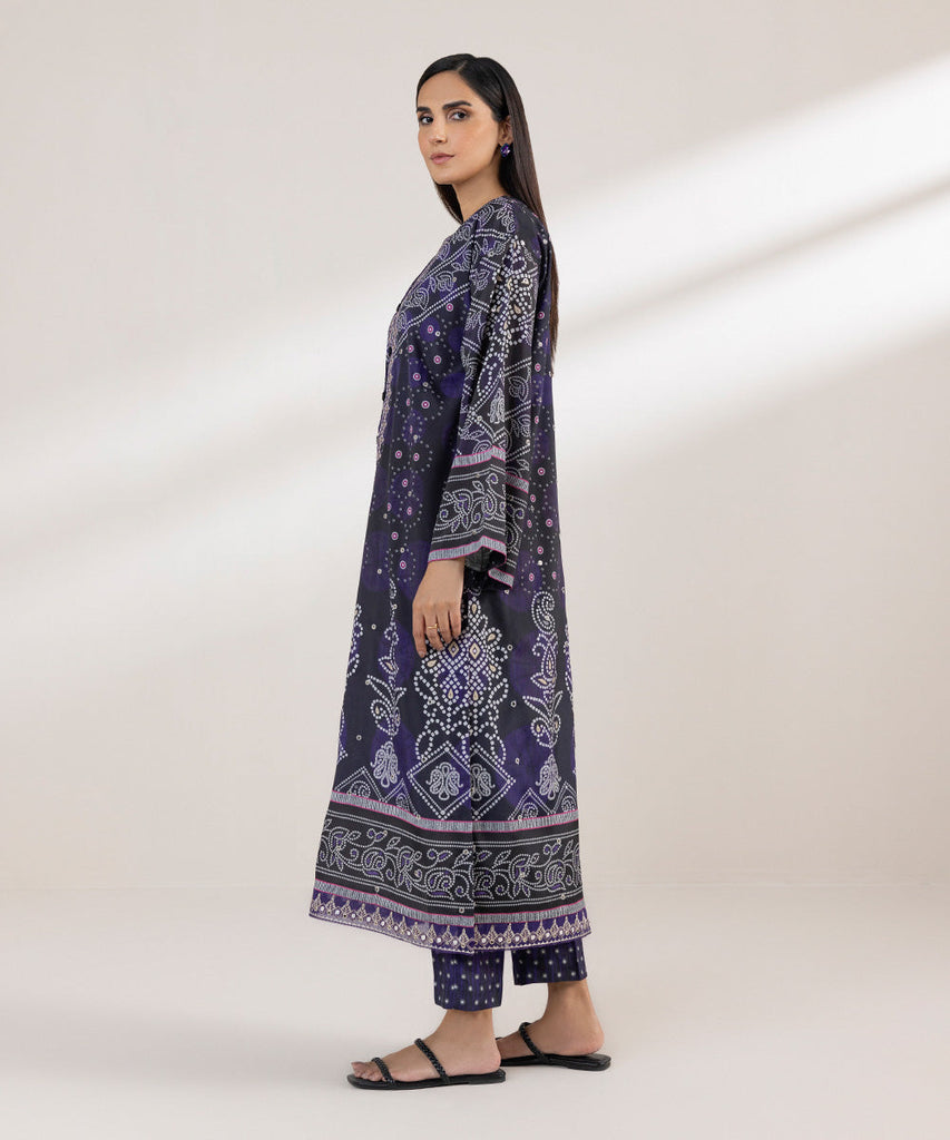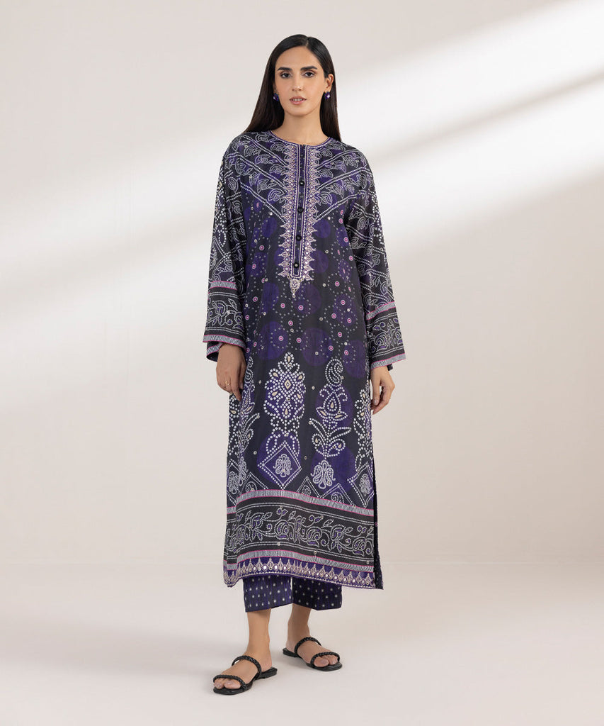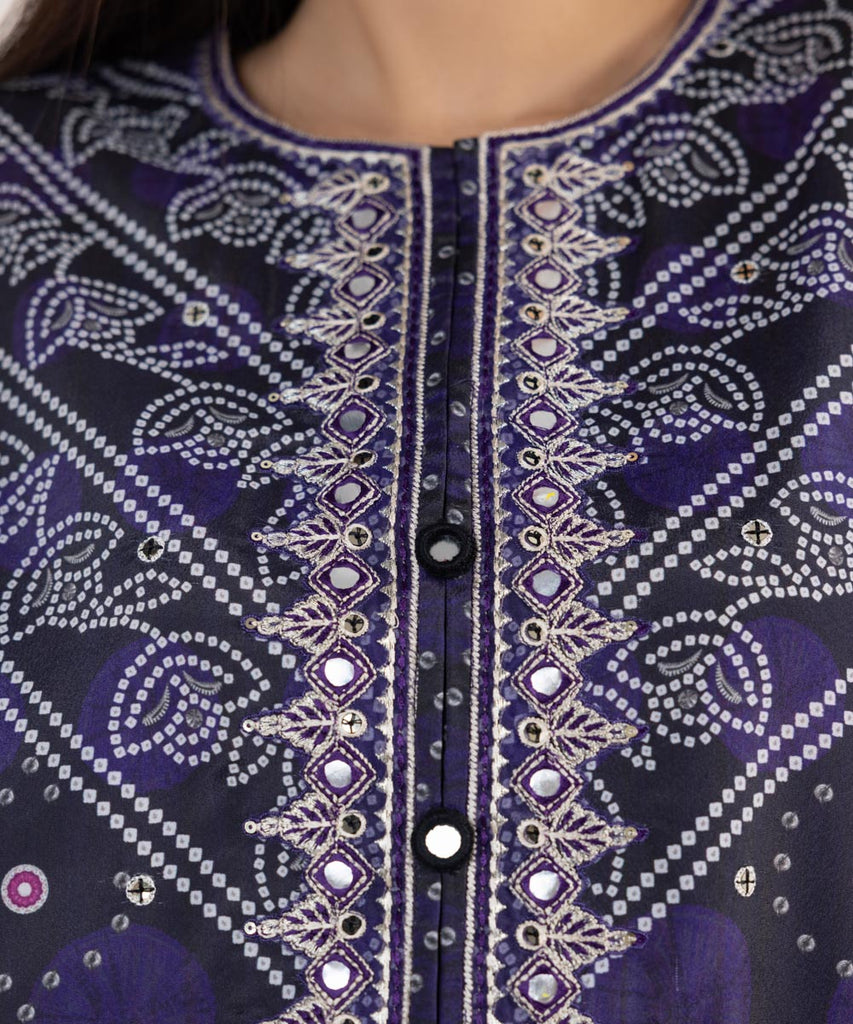 Create an elegant Eid look with our printed and embroidered silk two-piece, featuring a blended satin long straight shirt with cigarette pants in purple.