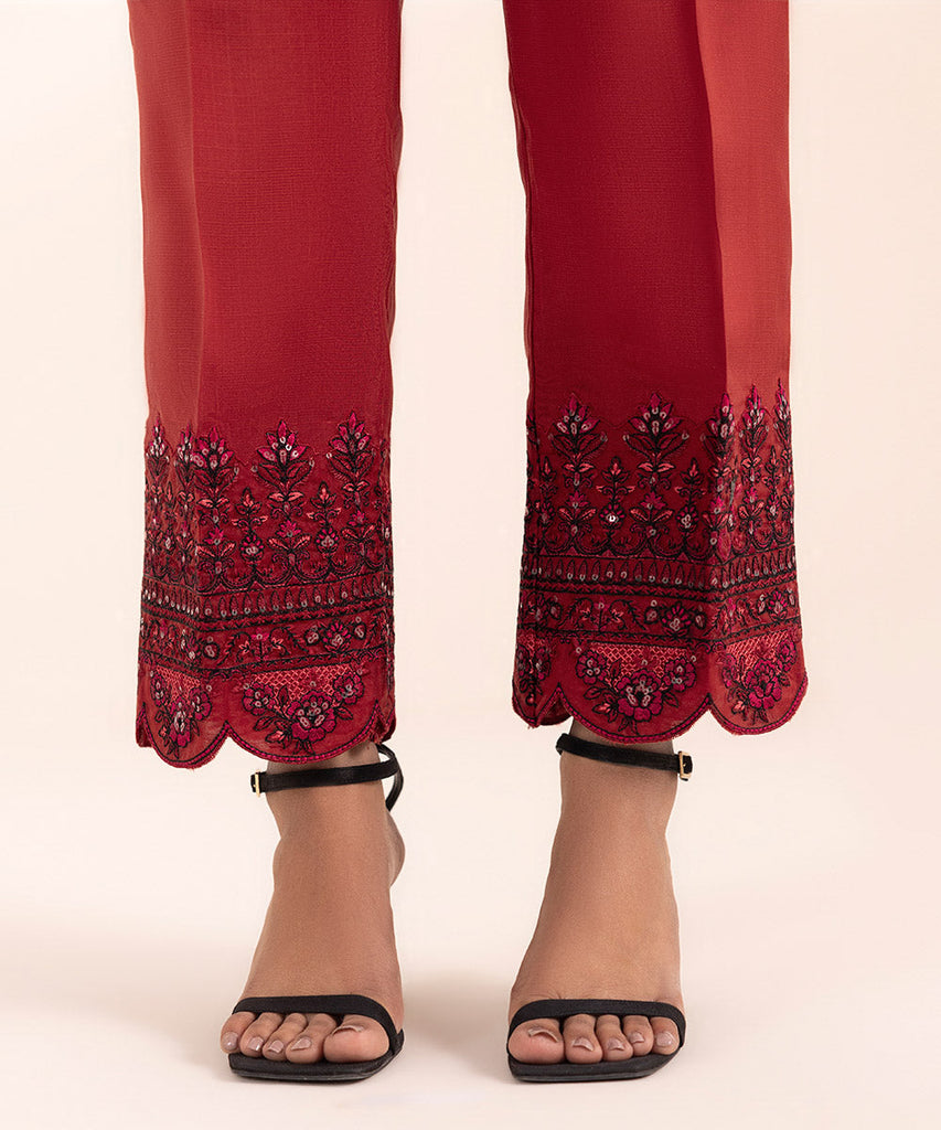 Perfect your summer style with our three-piece deep red suit featuring an embroidered shirt, scalloped straight pants, and printed dupatta.